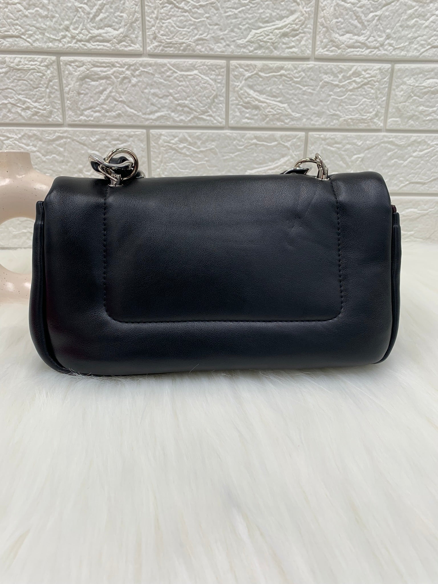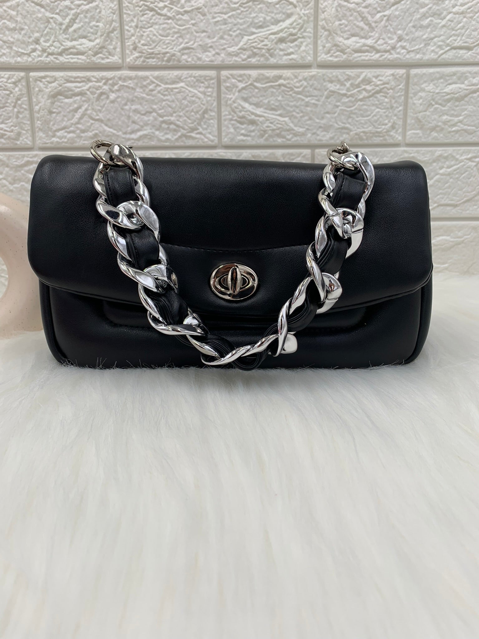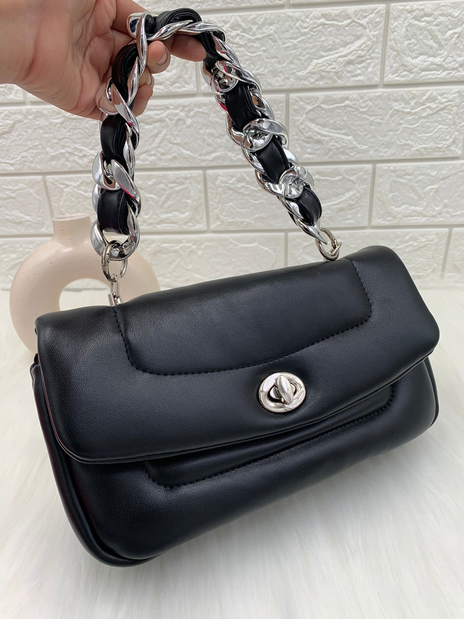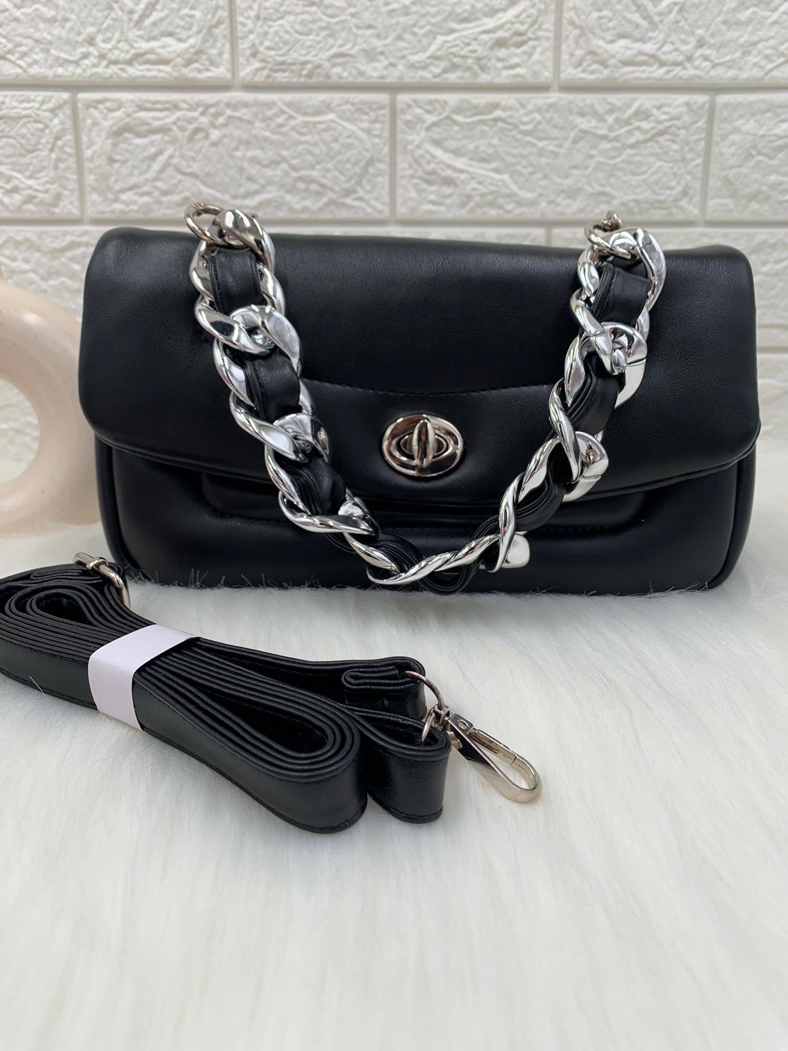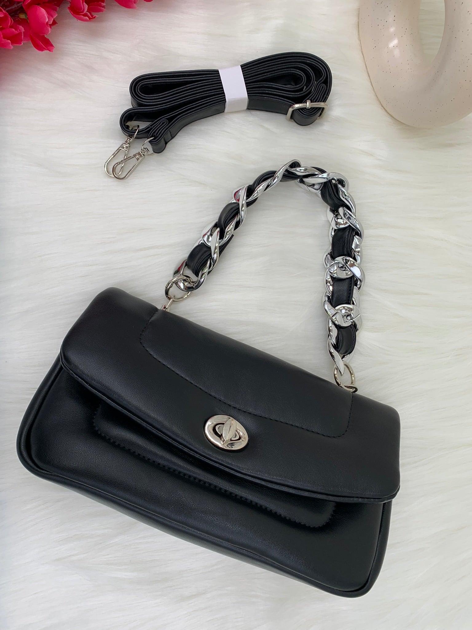 This stylish bag features a spacious main compartment, a secure twisted lock, and an inner pocket for organization. Designed with a shoulder strap and a detachable sling strap, it’s perfect for any occasion.