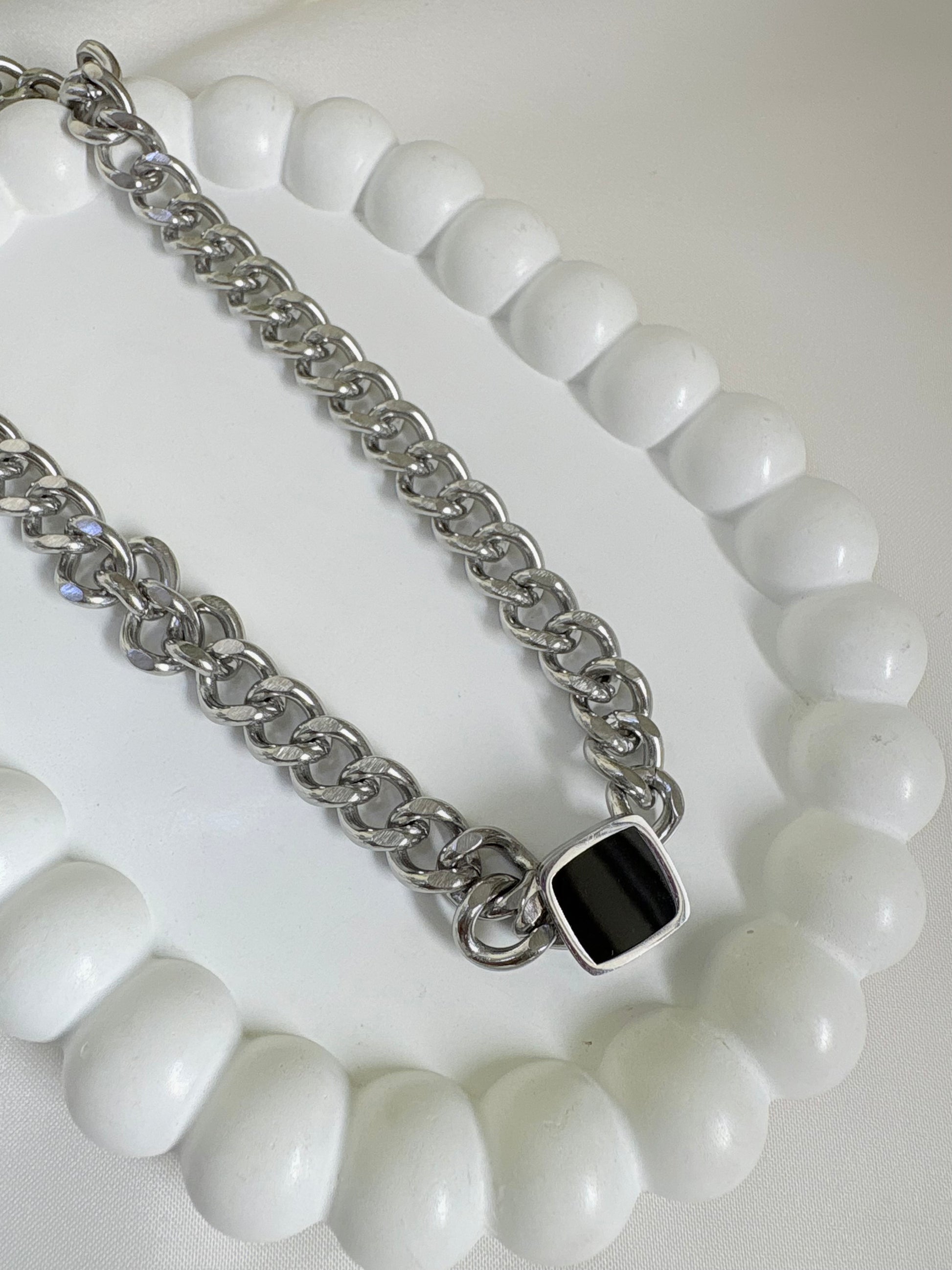 Bold Silver-Plated Cuban Link Chain Necklace with Black Accent Pendant