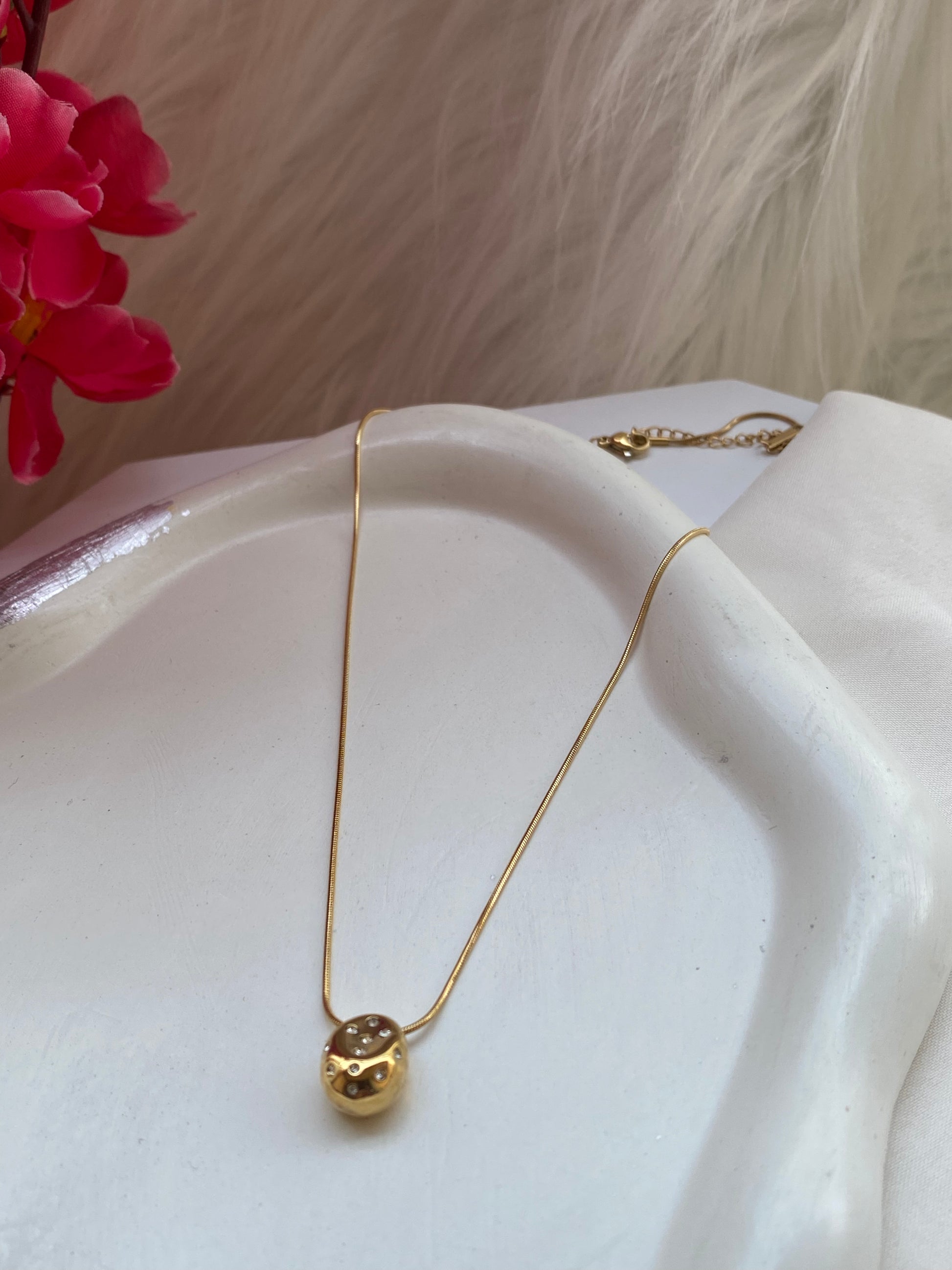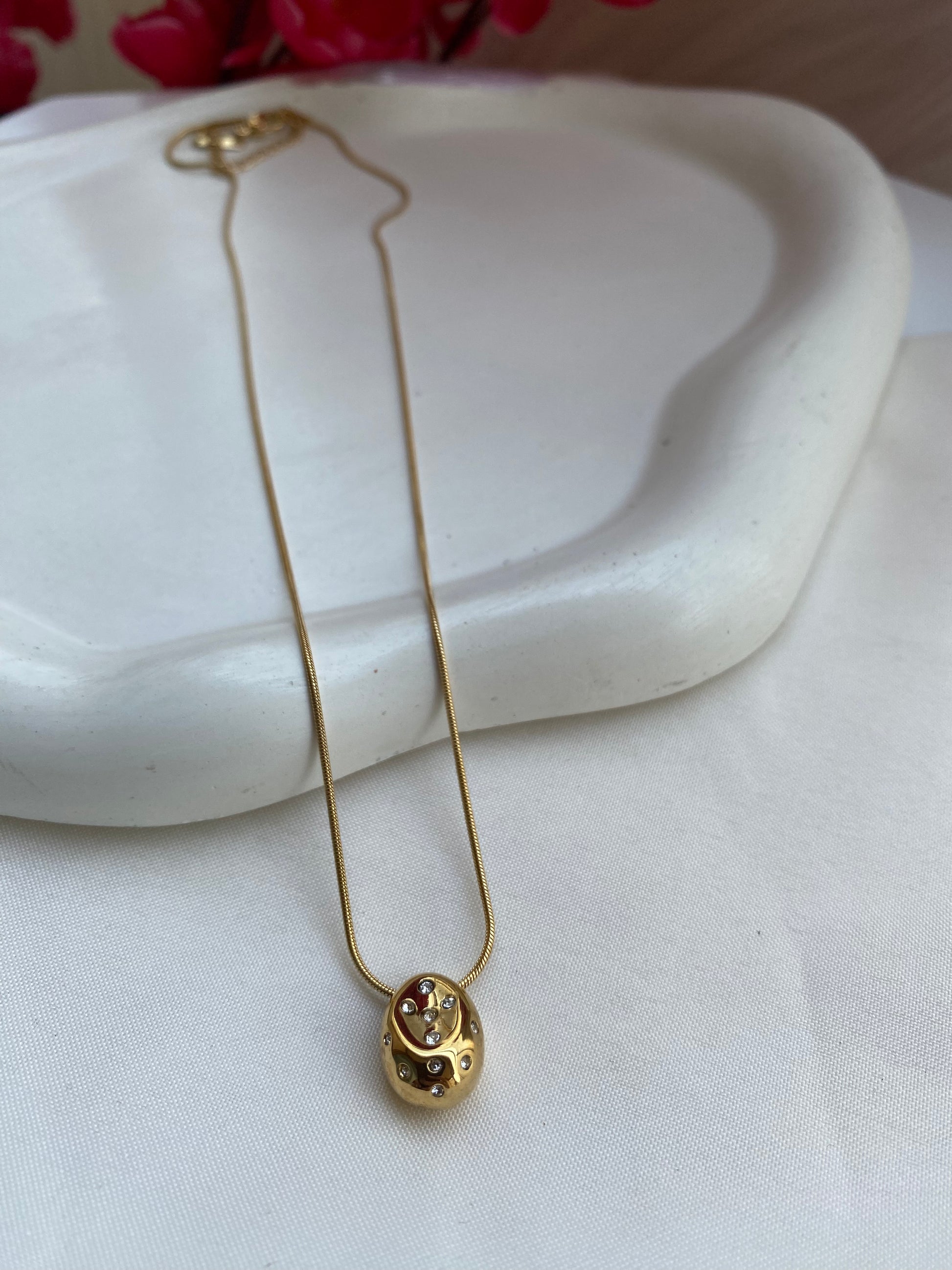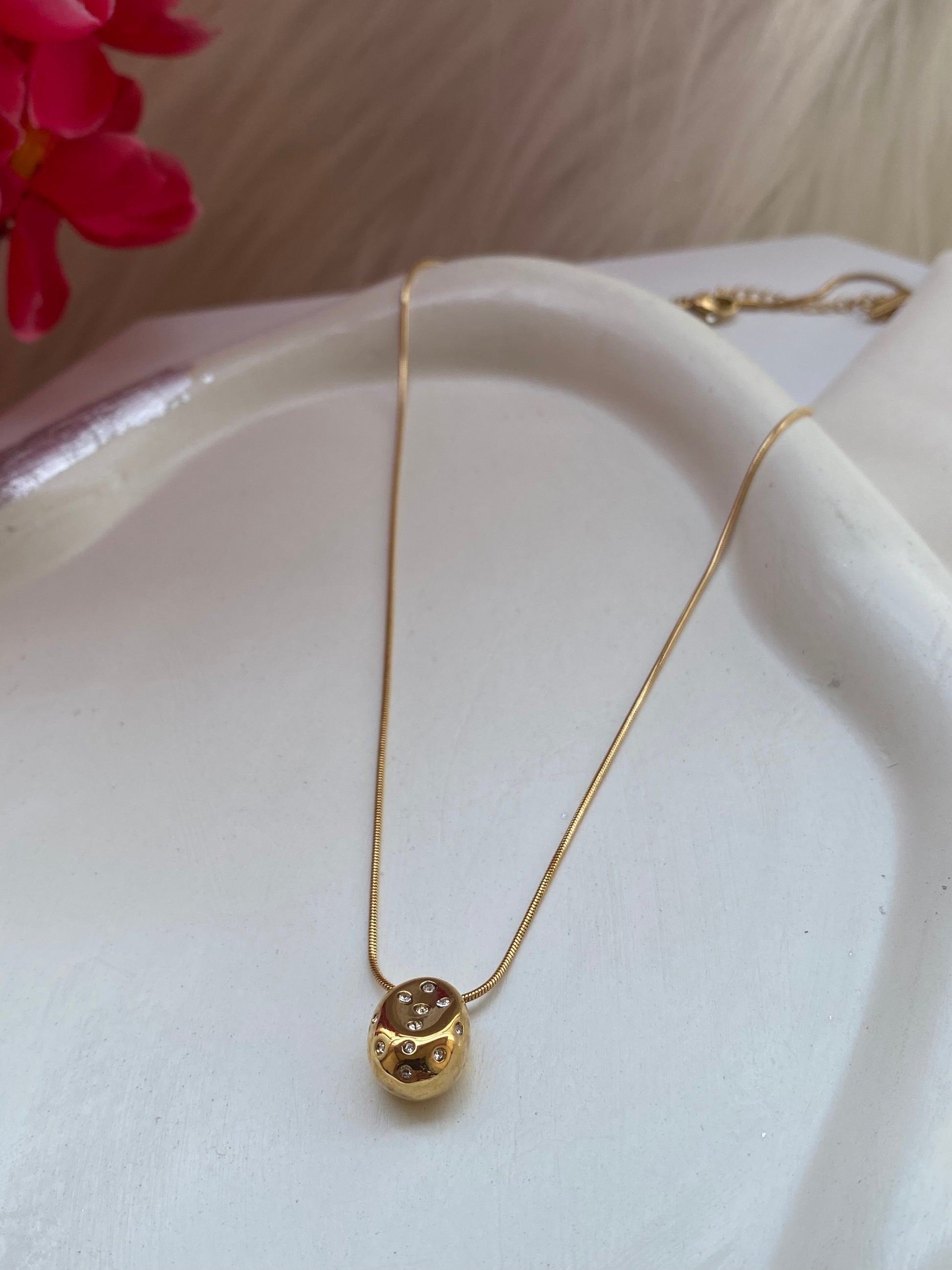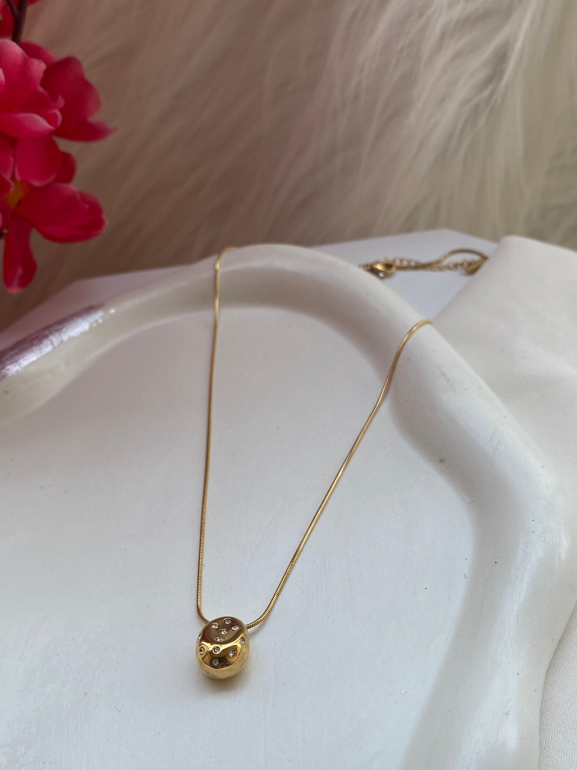 If you are looking for simple and pretty so there is a beautiful drop pebble charm necklace. It's got a little little diamond in the centre of the pearl that makes it look oh-so-pretty!