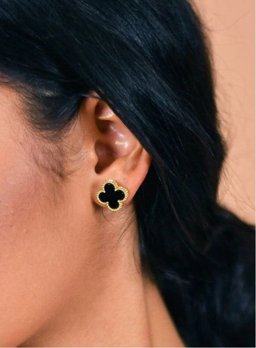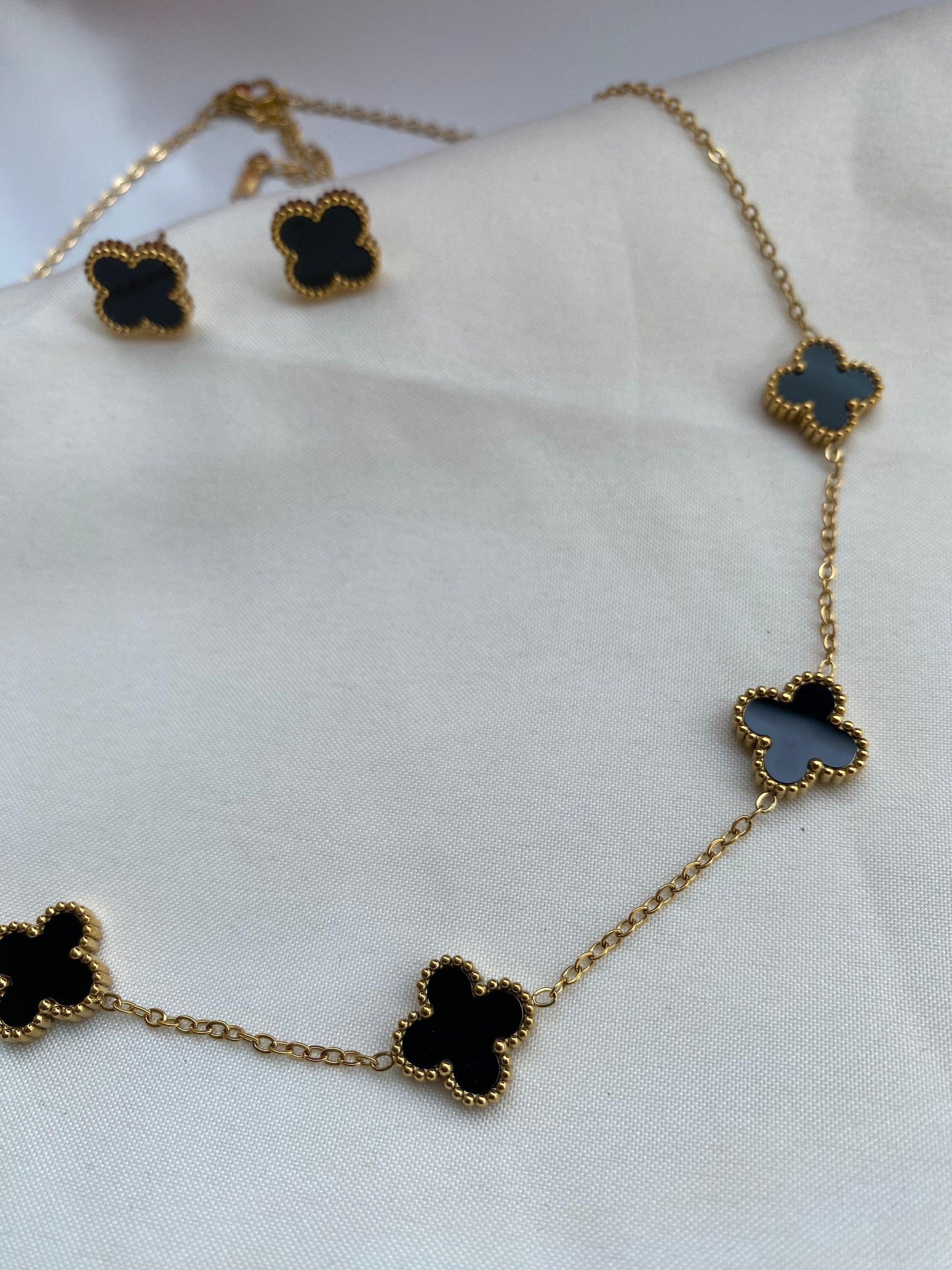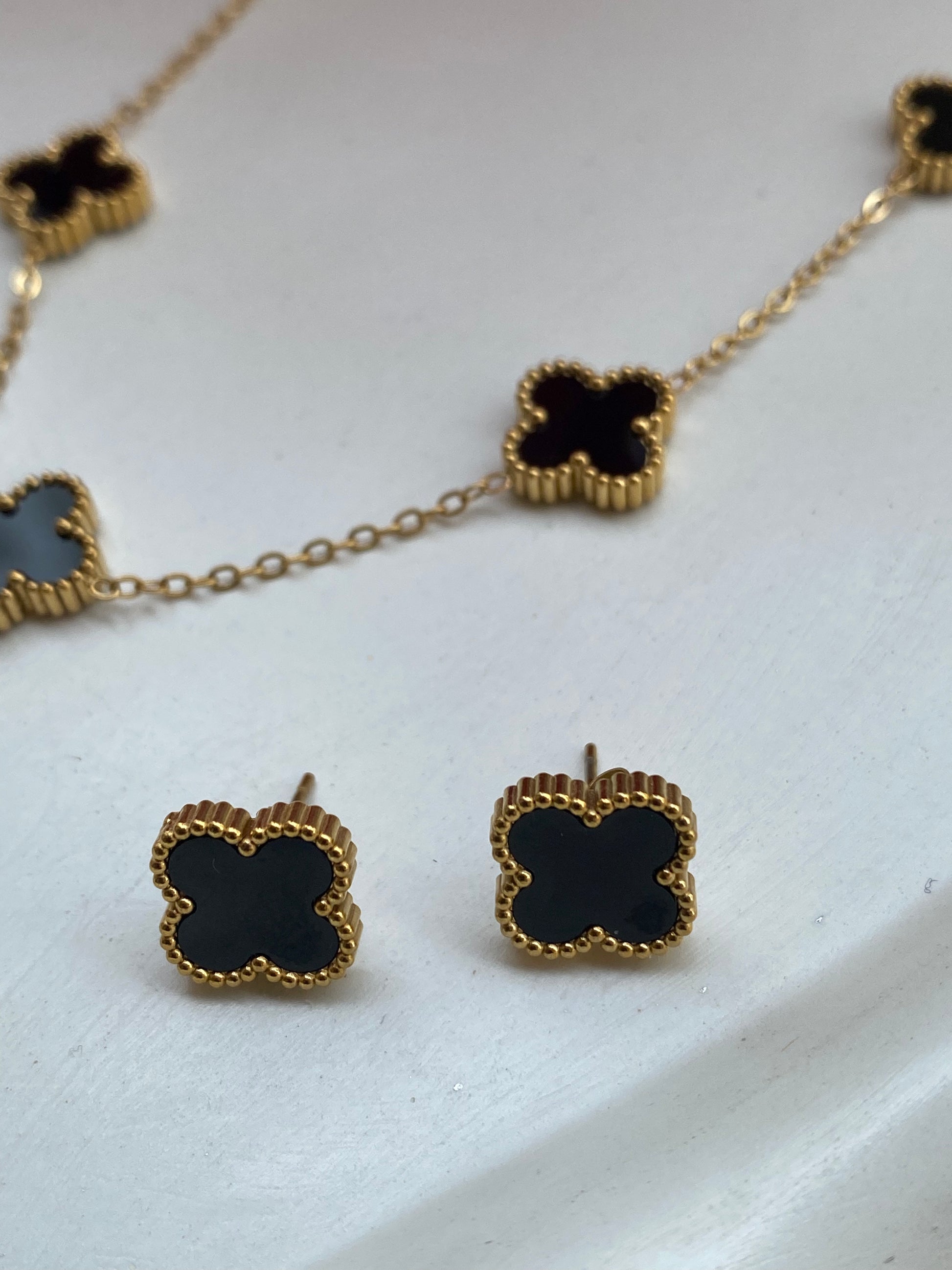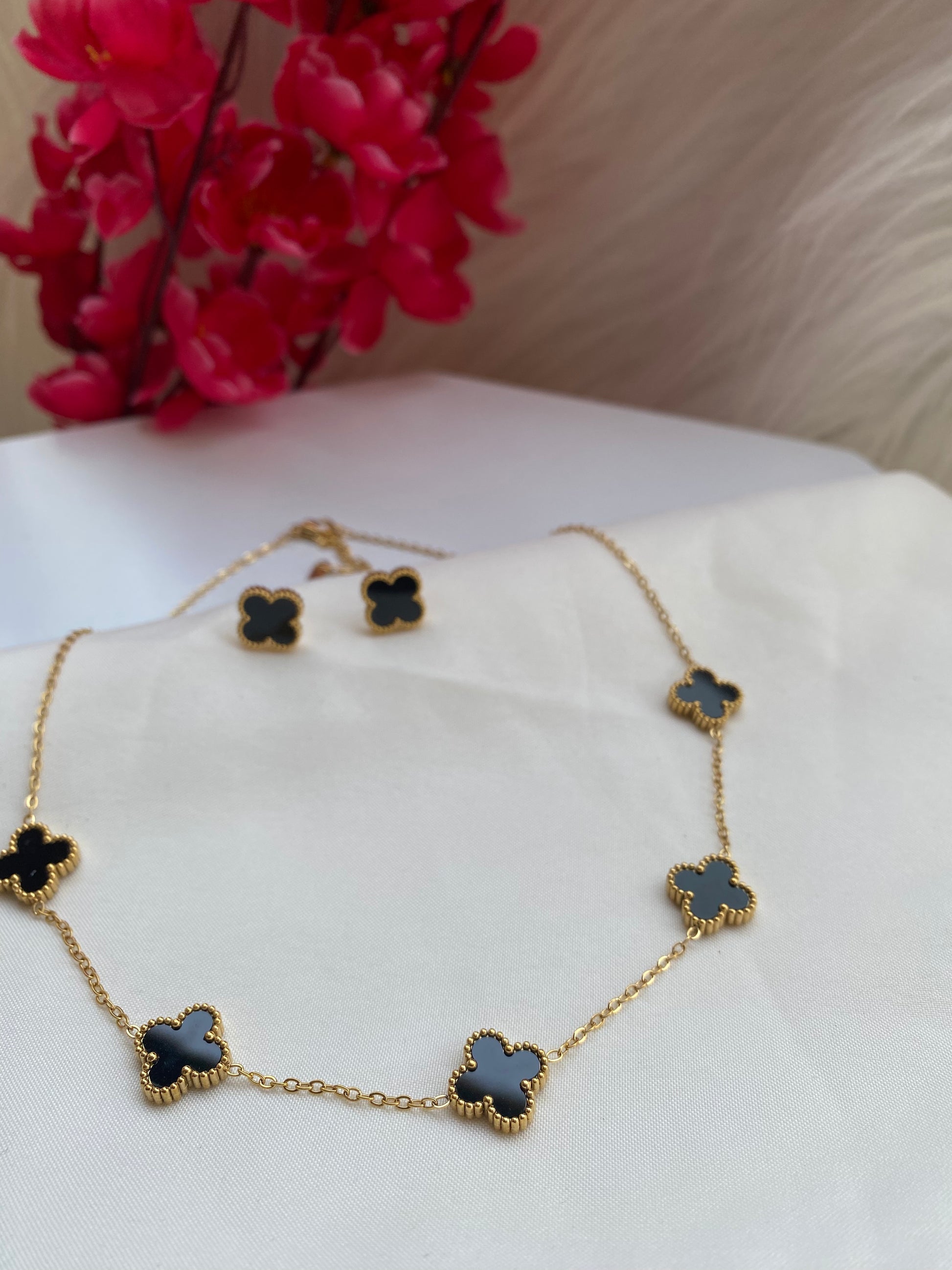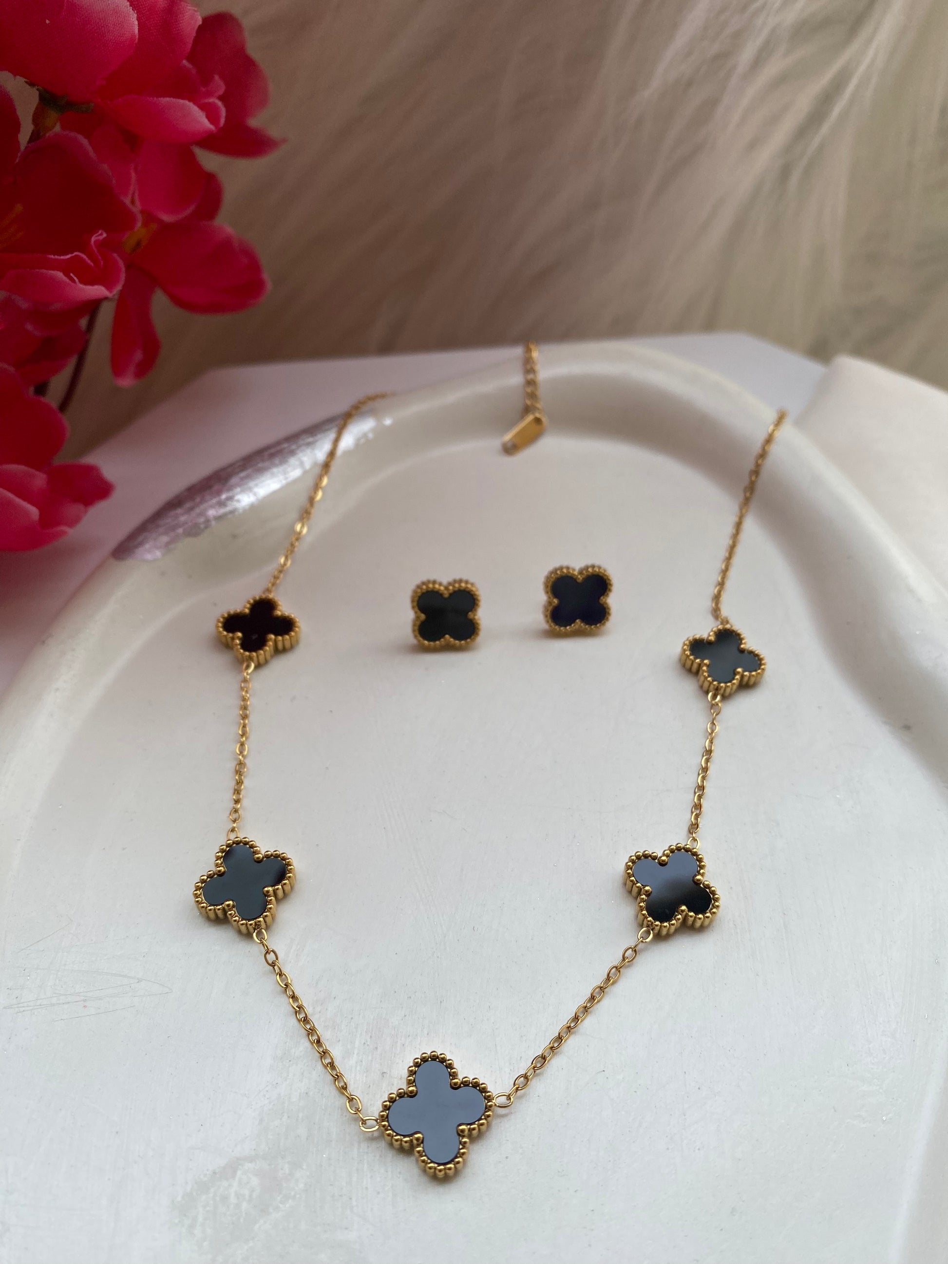 Black Four Leaf Charms Chain Necklace With Stud Earrings
