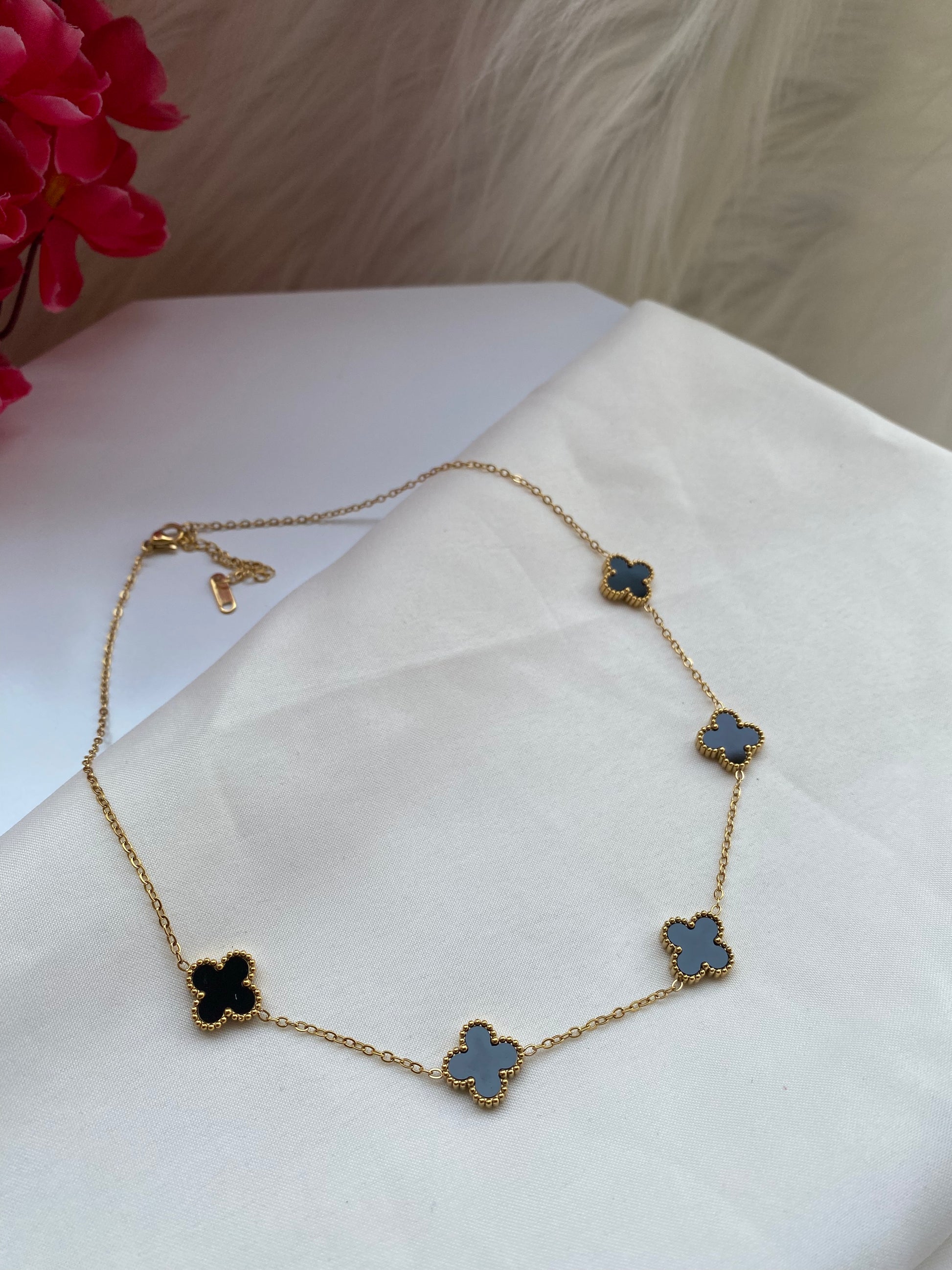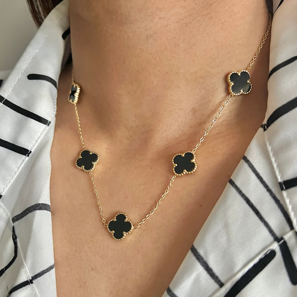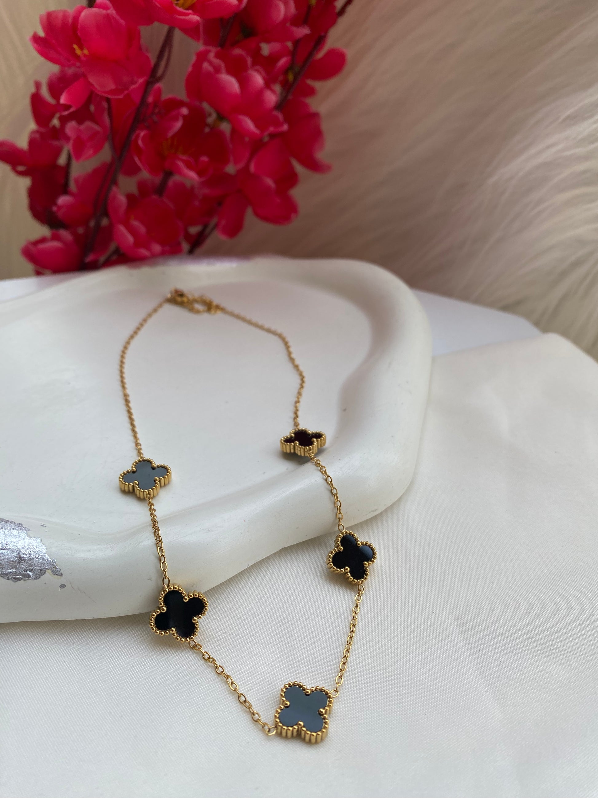 This black chain necklace is the perfect accessory for any girl. Featuring four leaf charms and a gold plated stainless steel chain, this necklace adds a touch of elegance to any outfit. A must-have for any fashion-forward individual.