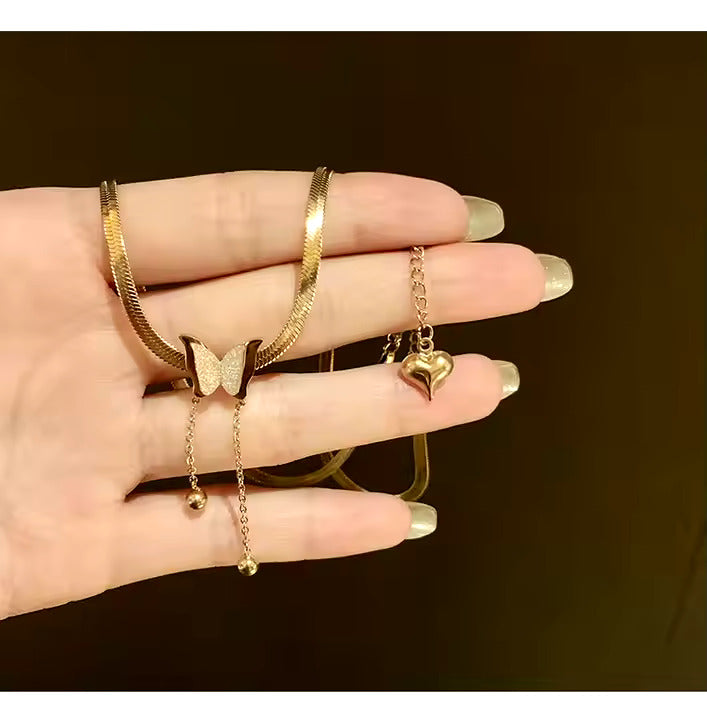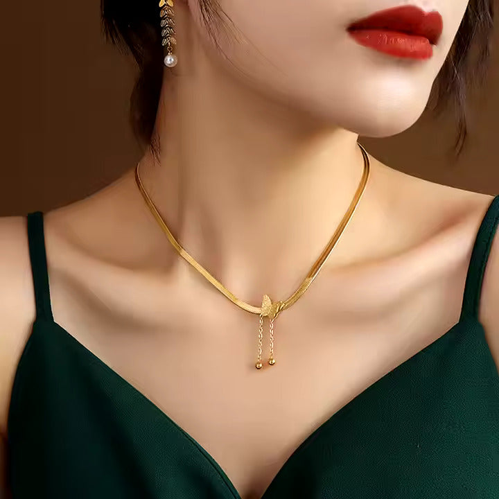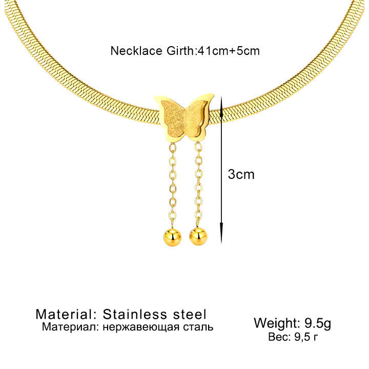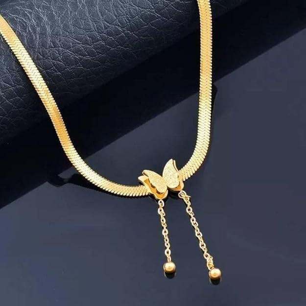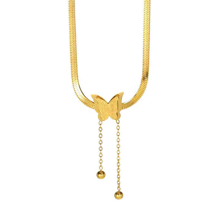 Add a touch of elegance to your look with our Butterfly Pendant Snake Chain Necklace. This stunning piece features a sleek, gold-plated snake chain paired with a delicate butterfly pendant, symbolizing grace and transformation. The pendant includes two dangling gold beads that add a subtle, playful charm, making it an eye-catching accessory perfect for any occasion.