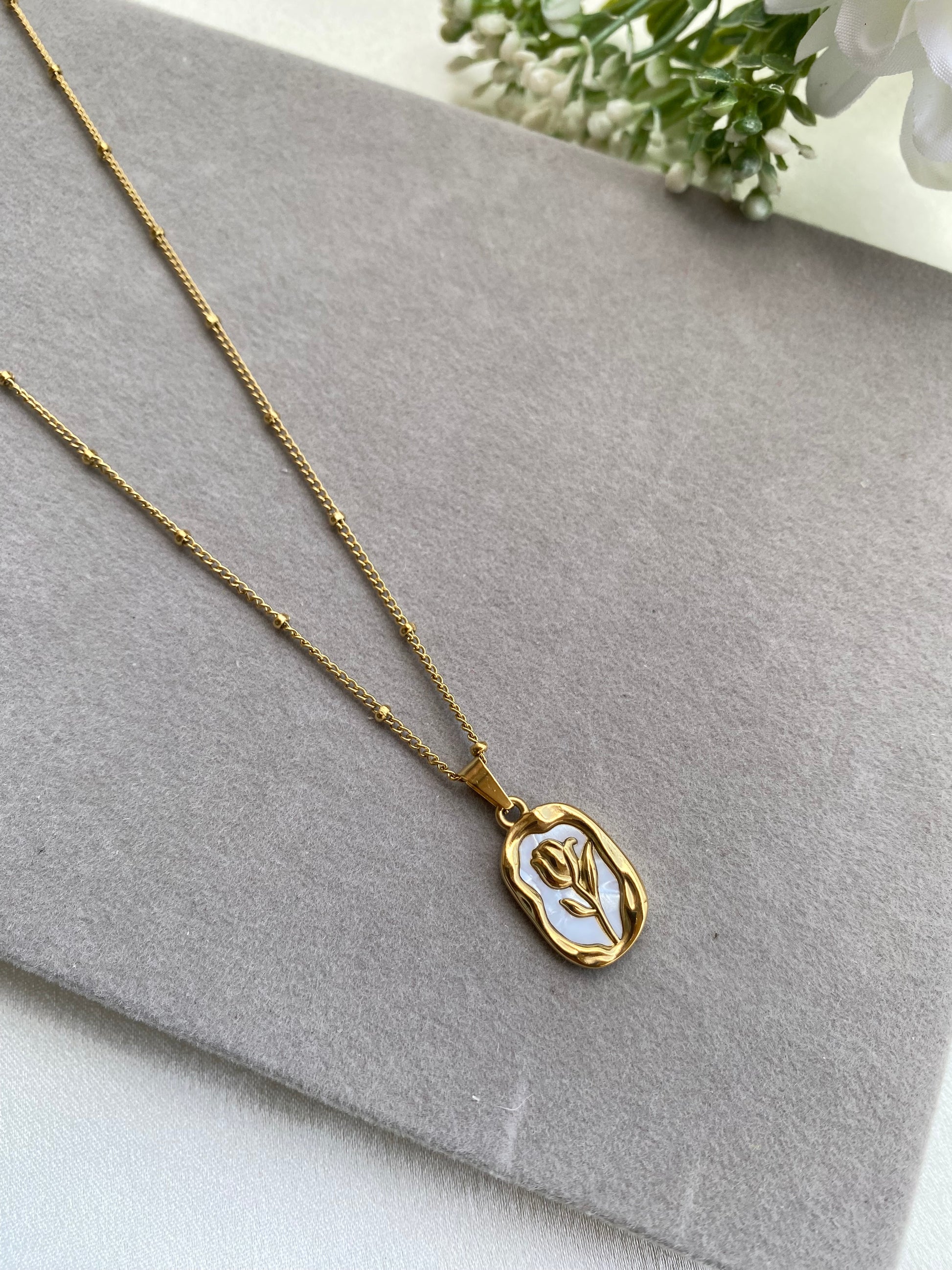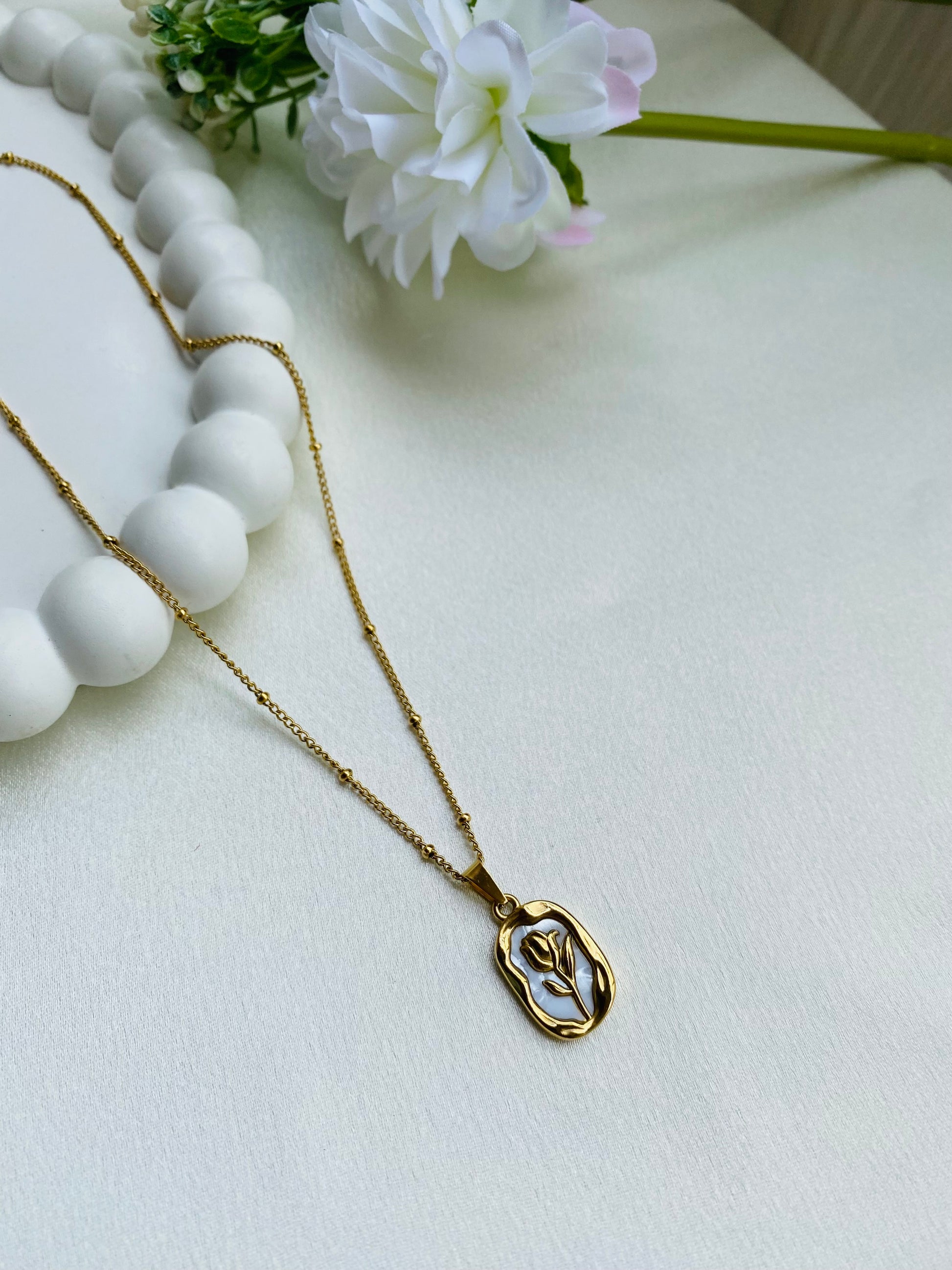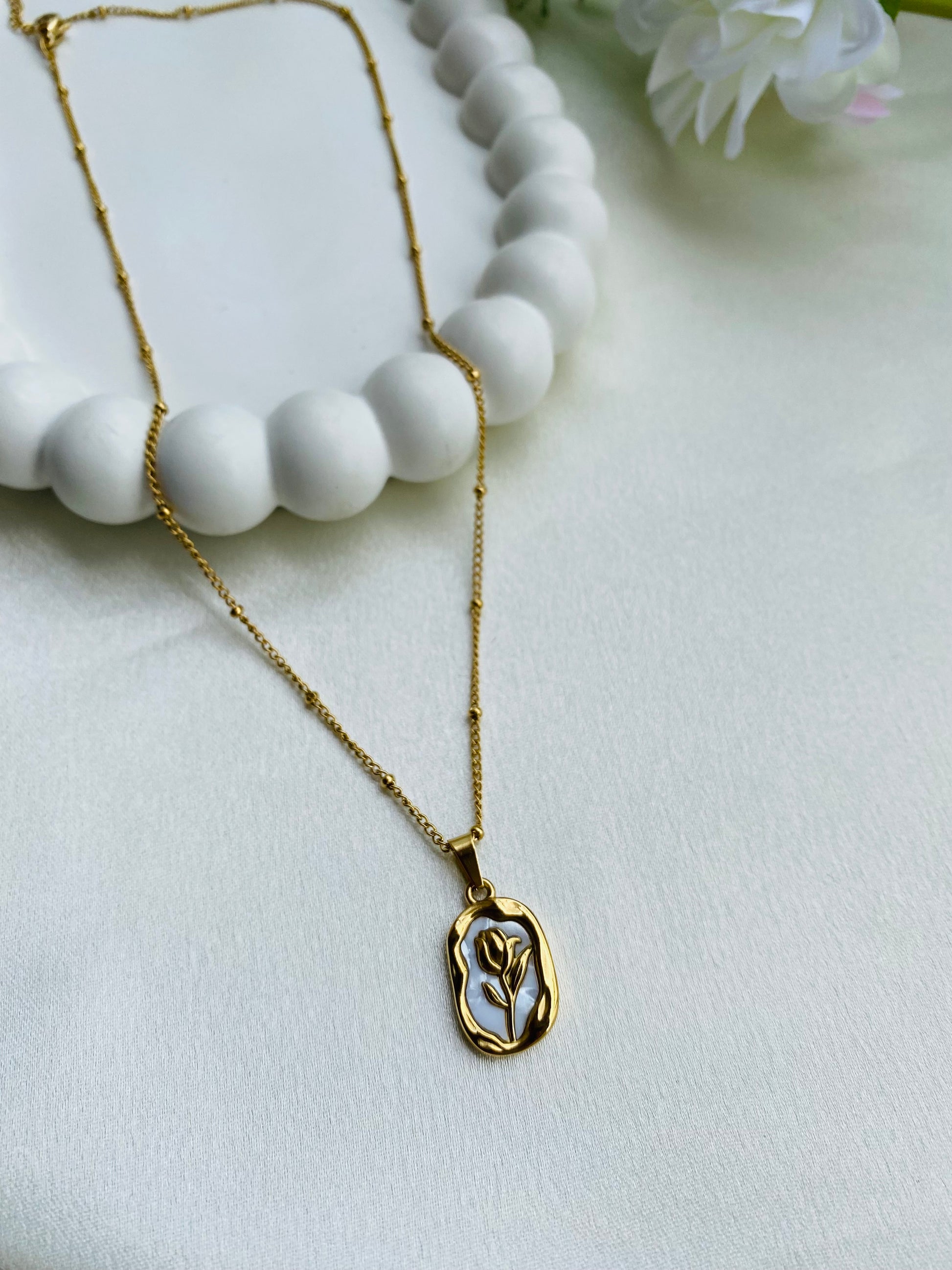 A perfect blend of elegance and durability. This necklace features a stunning white shell pendant, framed in high-quality, tarnish-resistant gold. Designed to maintain its shine, it's crafted from premium waterproof materials, making it suitable for everyday wear without losing its beauty.