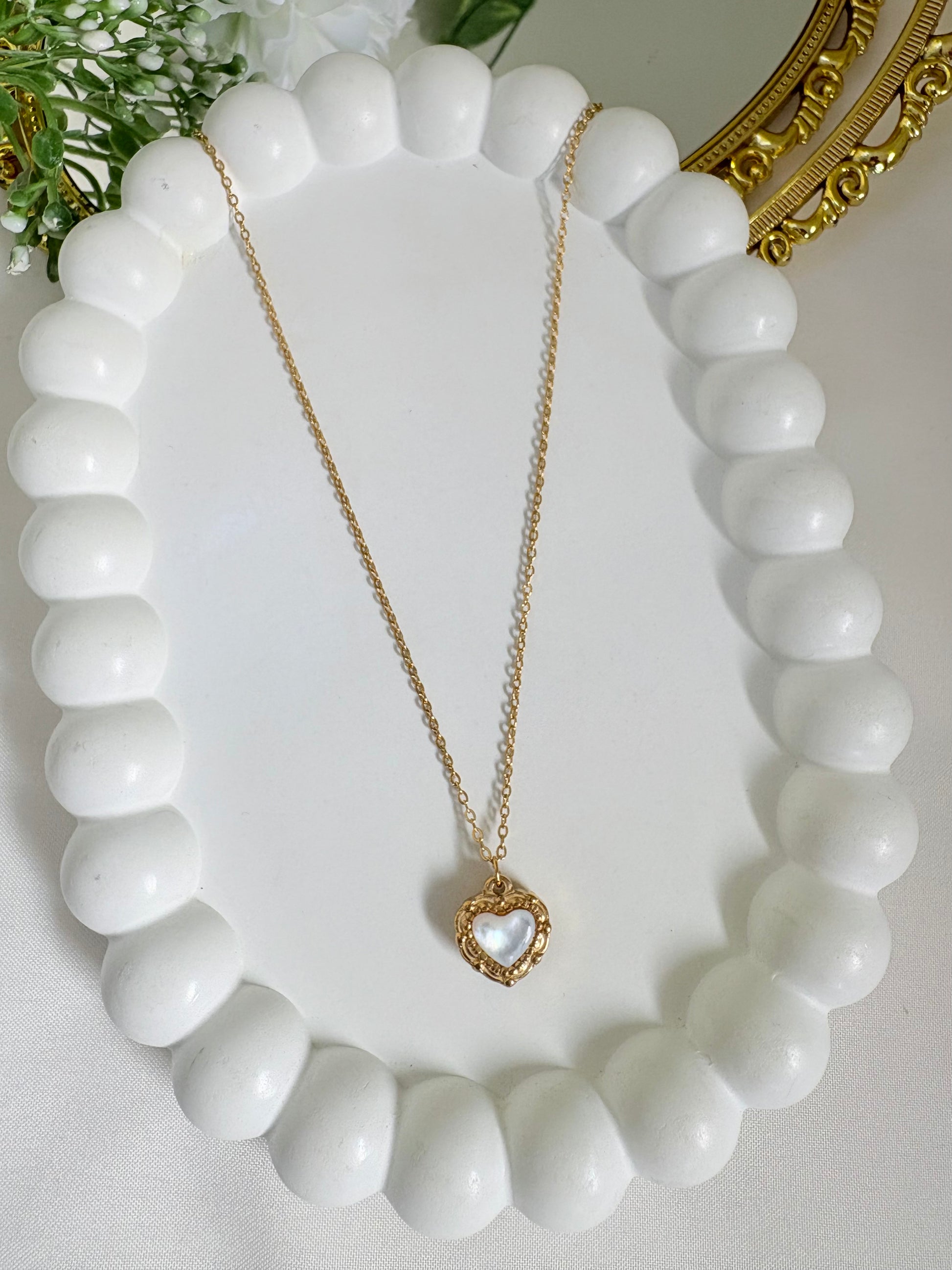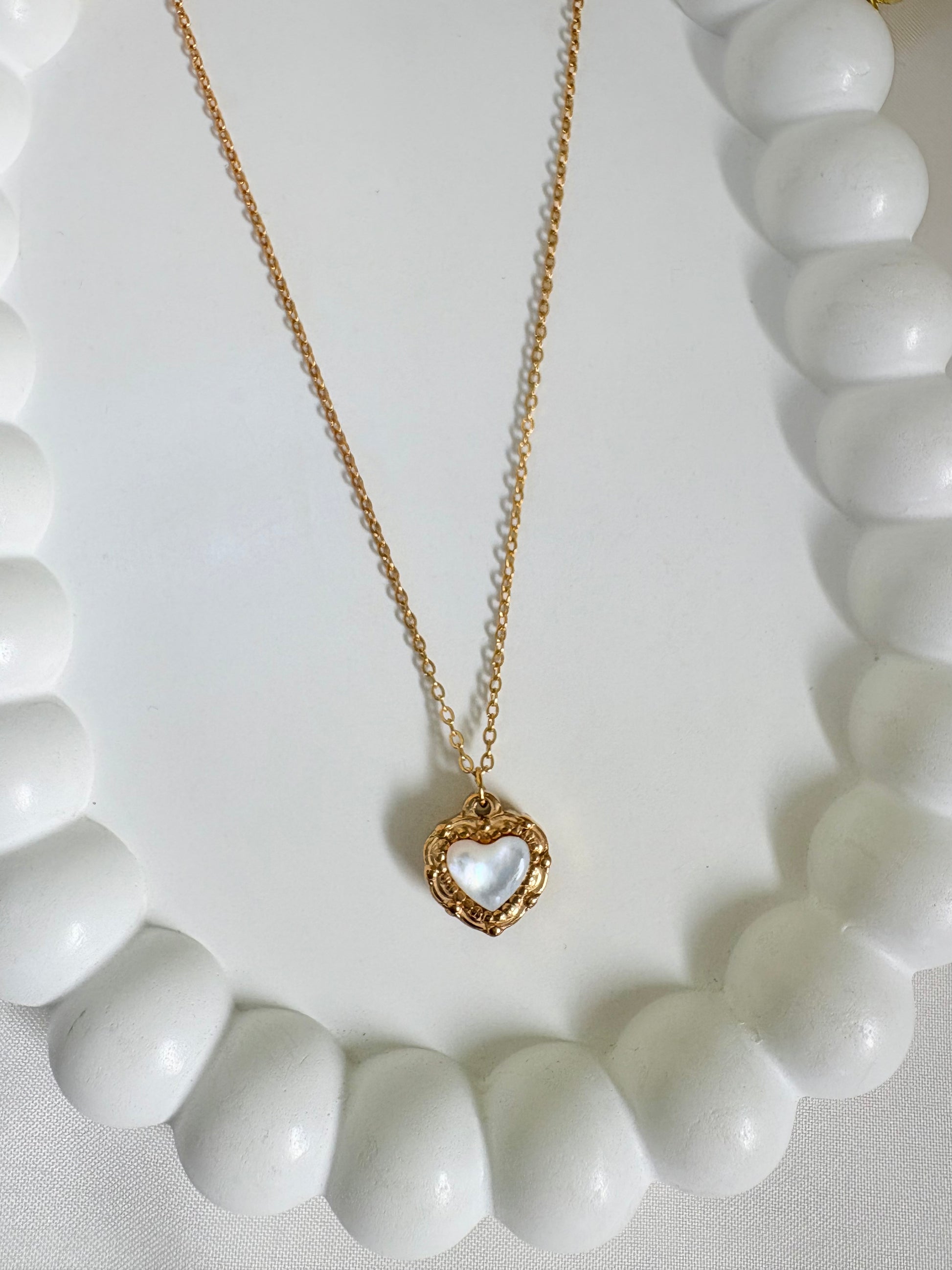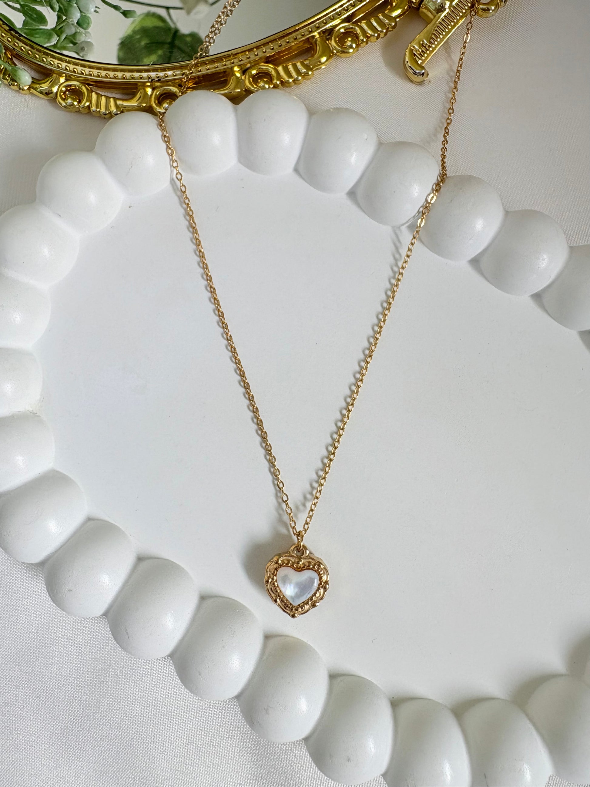 Add a touch of sophistication to your look with this stunning gold-plated heart pendant necklace. The delicate heart design features a luminous mother-of-pearl centerpiece, encased in an intricate vintage-inspired gold frame.