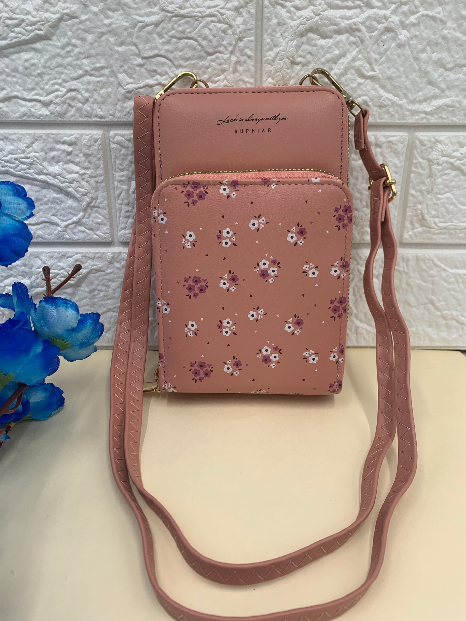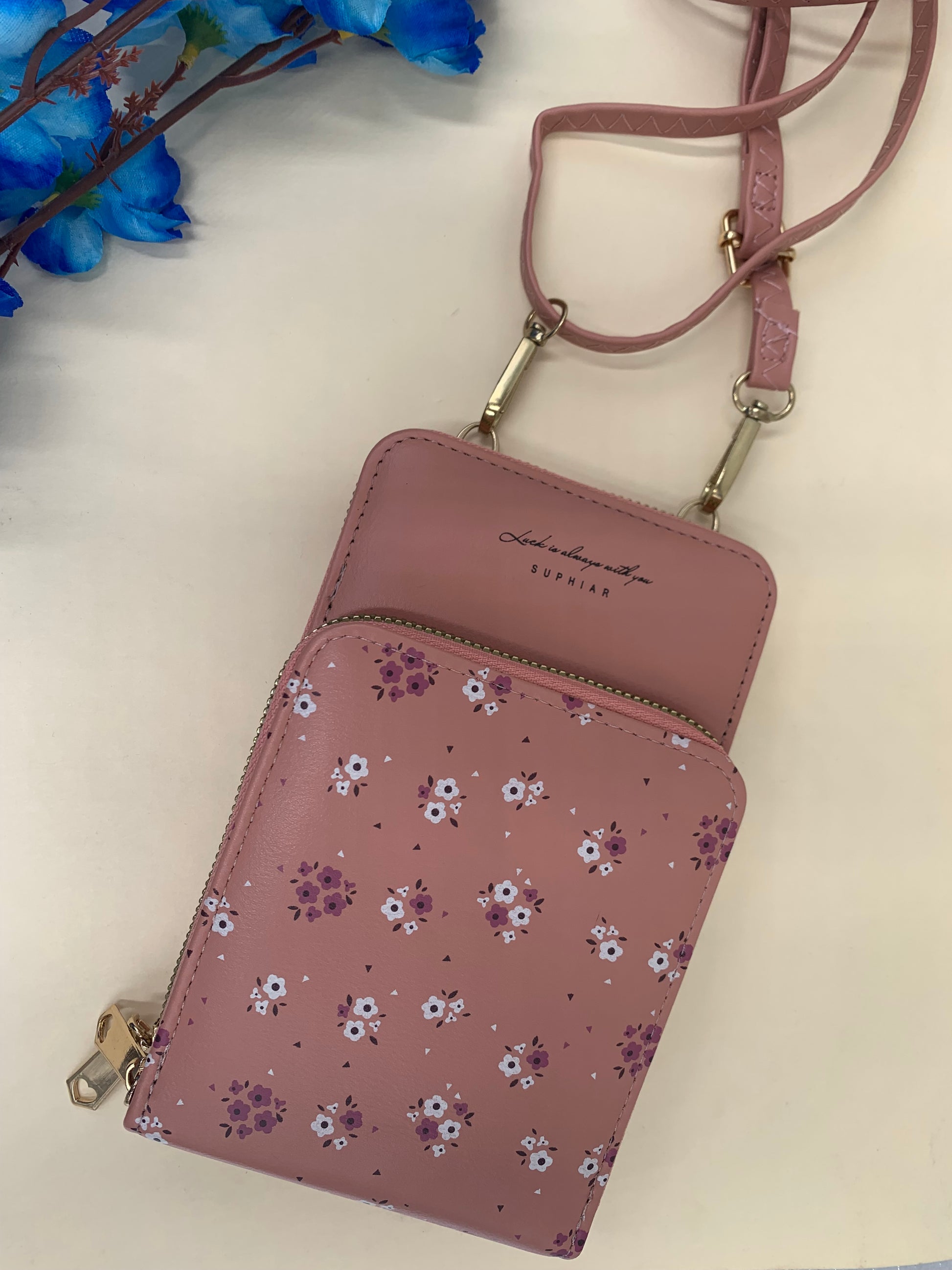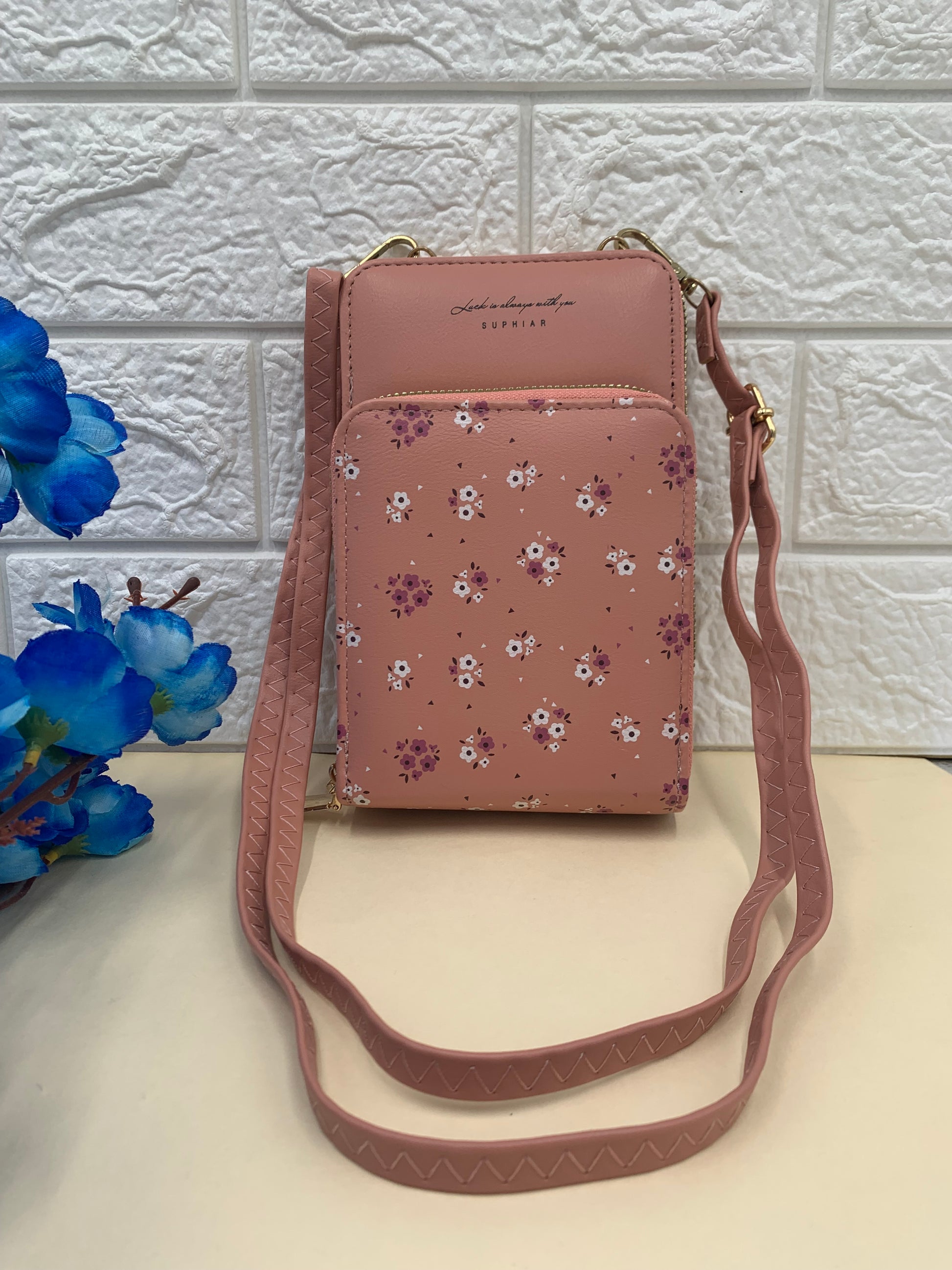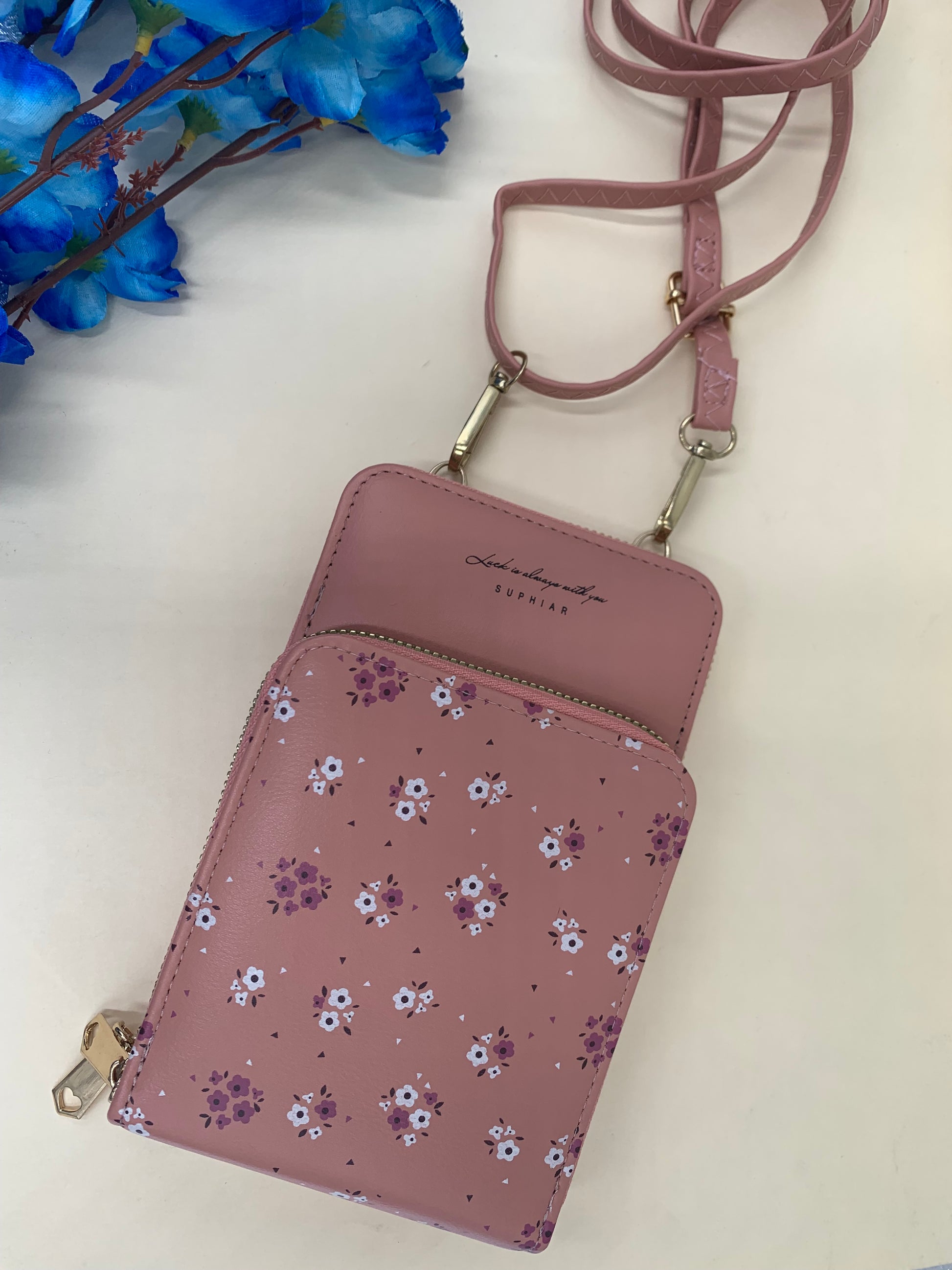 Pink flower printed mobile pouch , 2 main compartment, With a detachable sling strap