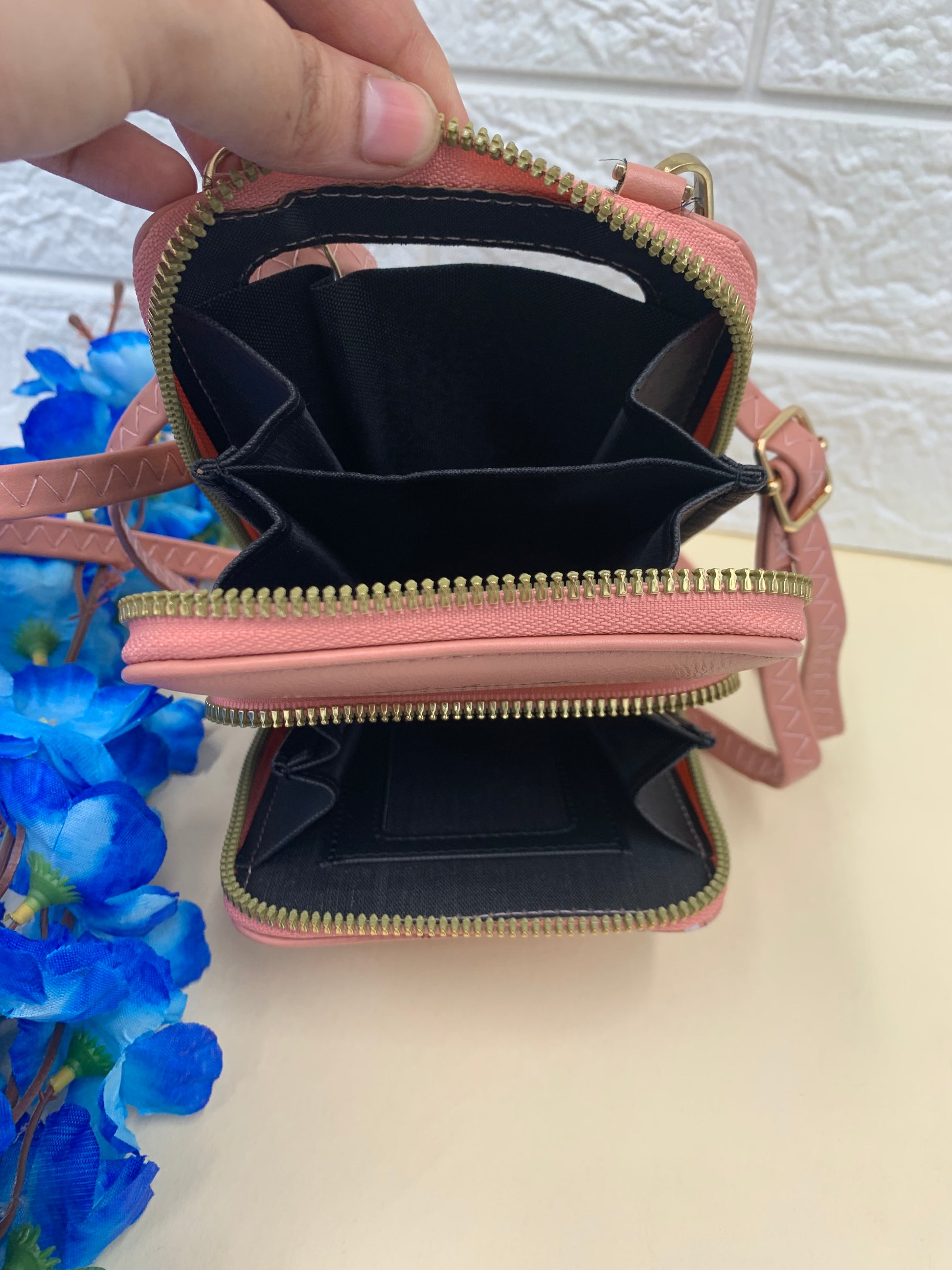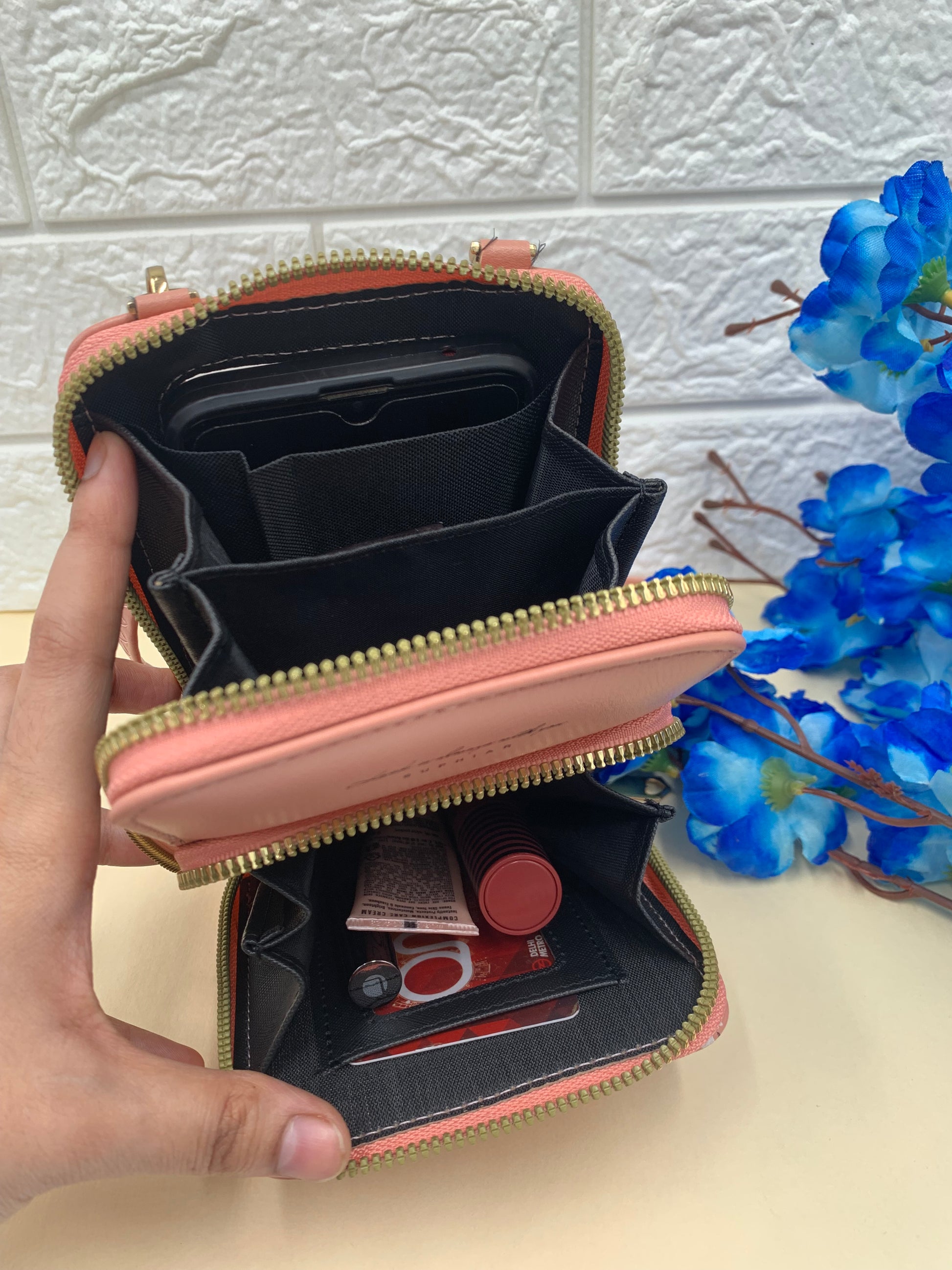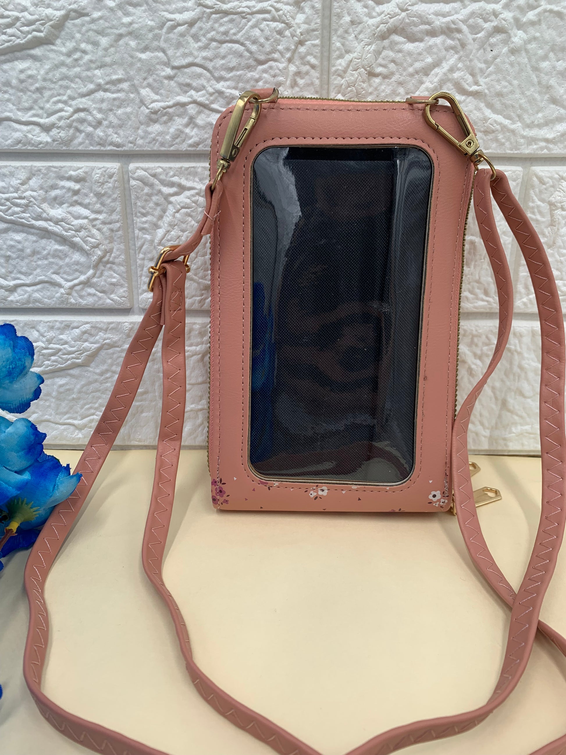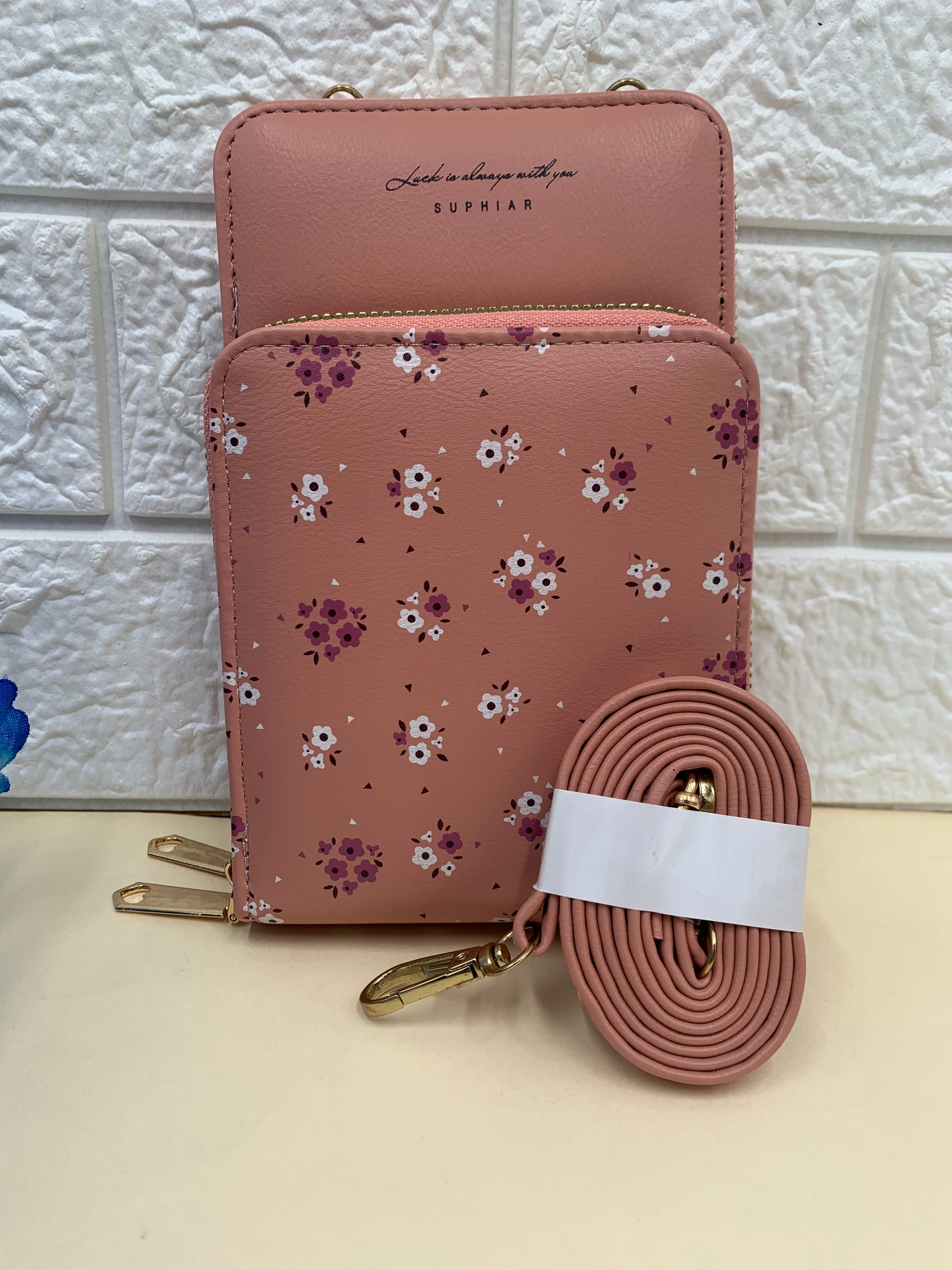 Pink flower printed mobile pouch , 2 main compartment, With a detachable sling strap
