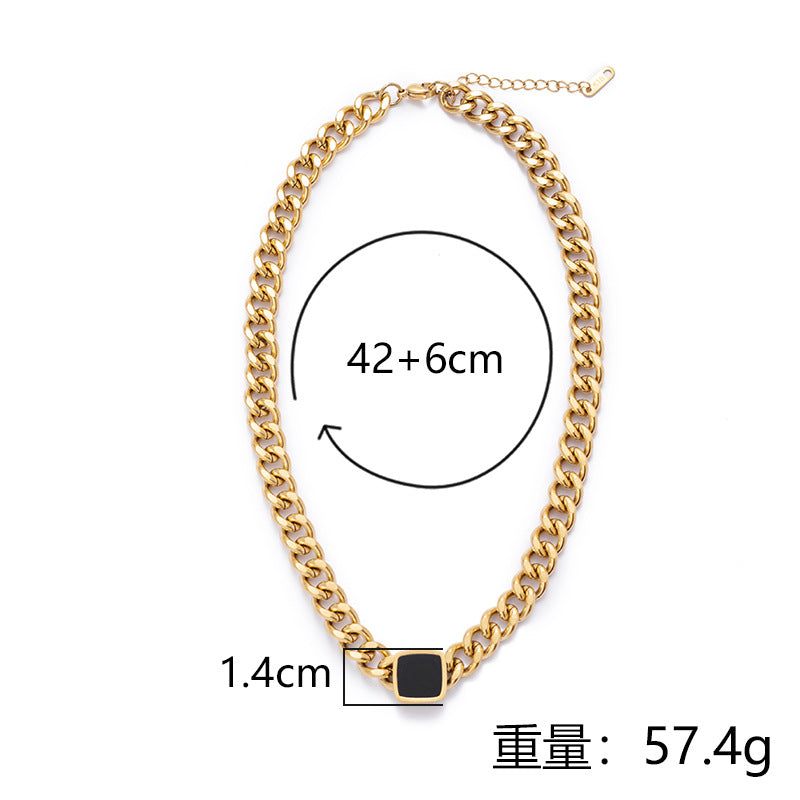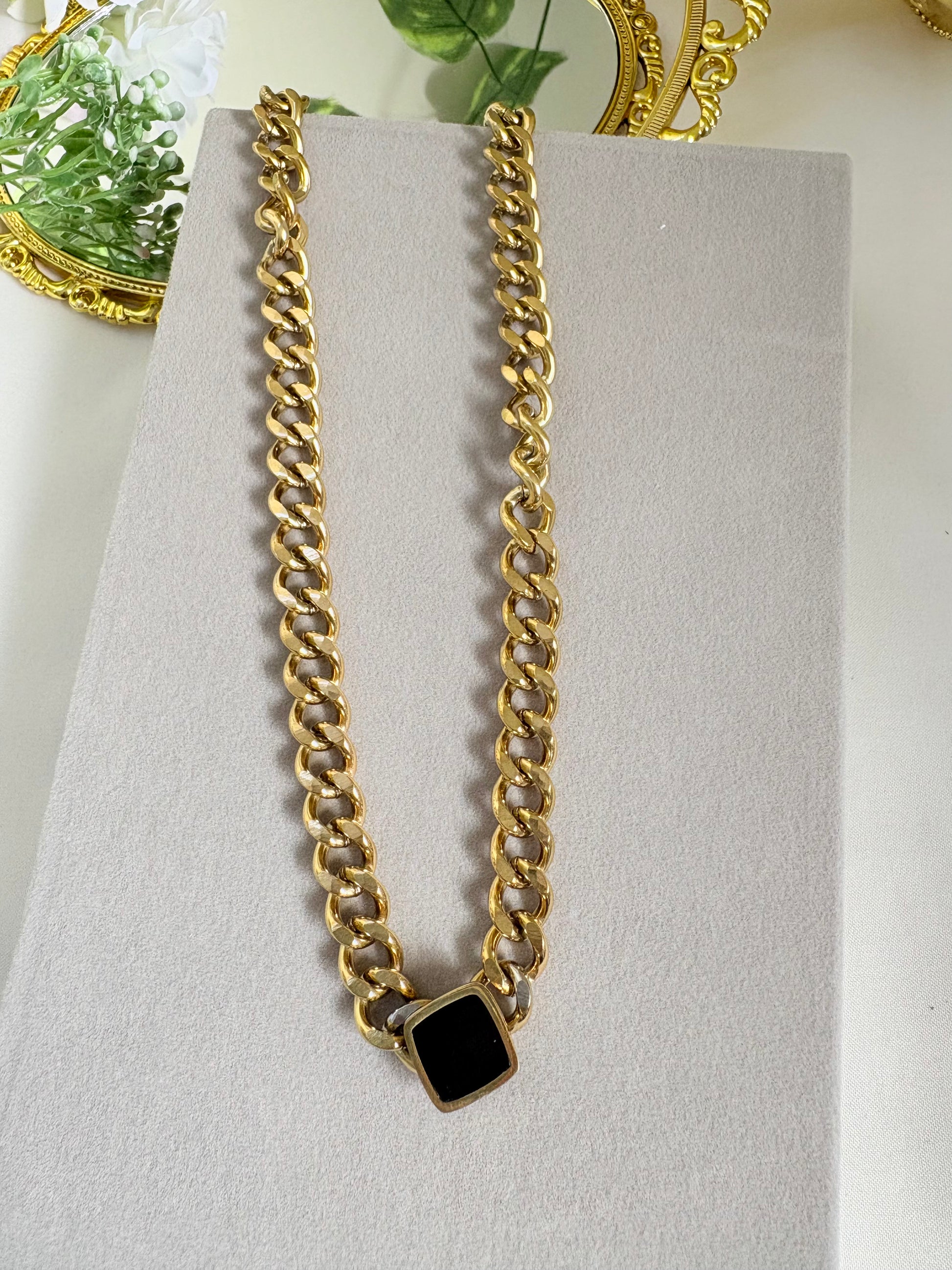 Make a statement with this bold and stylish gold-plated Cuban link chain necklace. Designed for those who love edgy yet elegant accessories, this necklace features a chunky chain with a striking black square accent pendant, perfect for elevating any look.