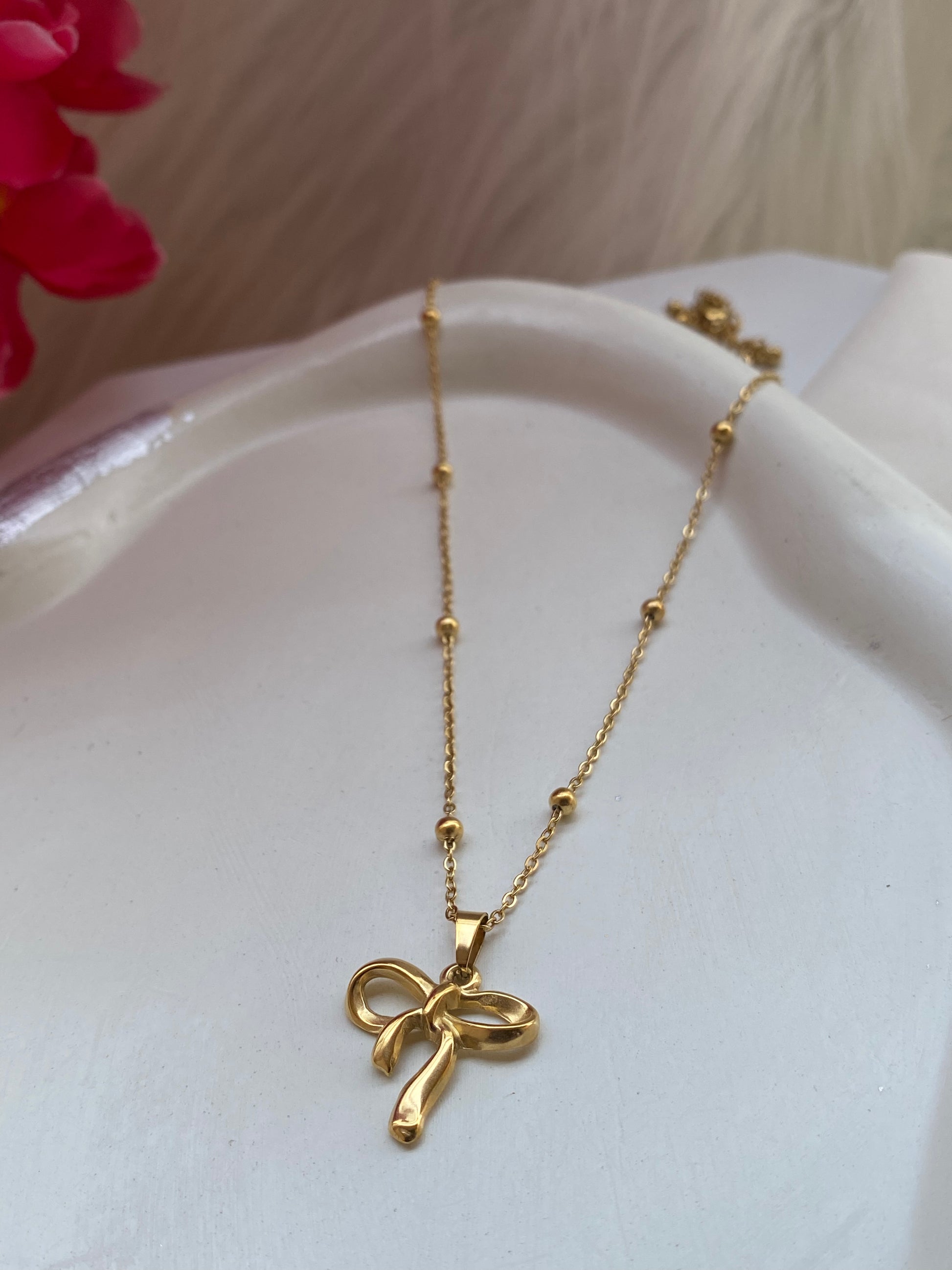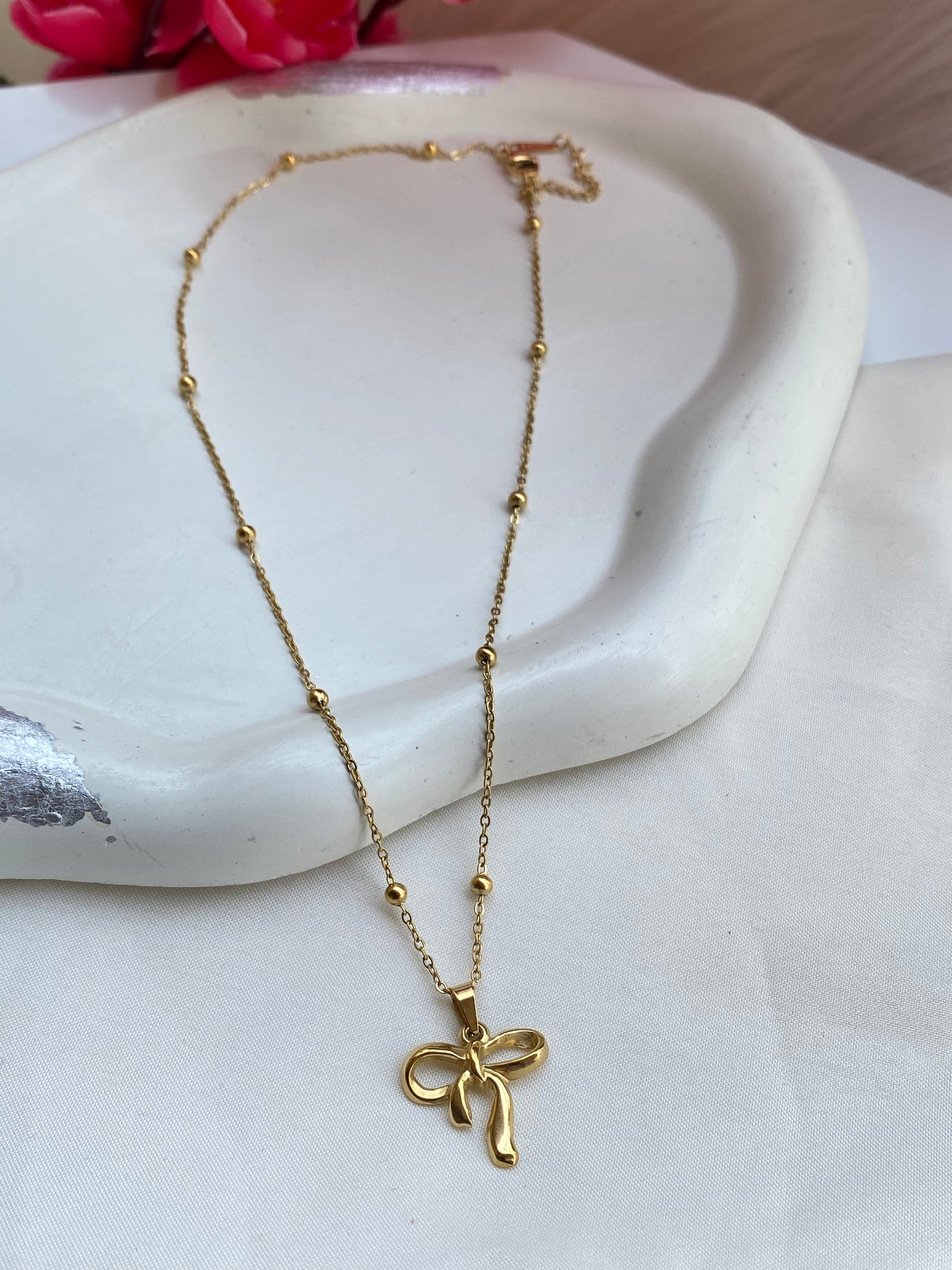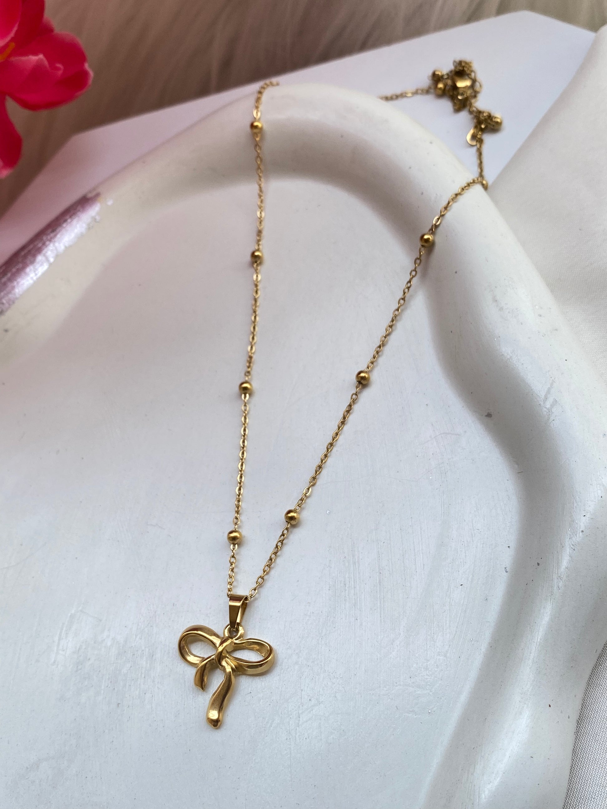 This bow necklace is crafted with finesse. Boasting a delicate snake bone chain design and a lustrous finish, it drapes elegantly around the neck, adding sophisticated elegance and flair. A timeless piece that embodies classic luxury.
