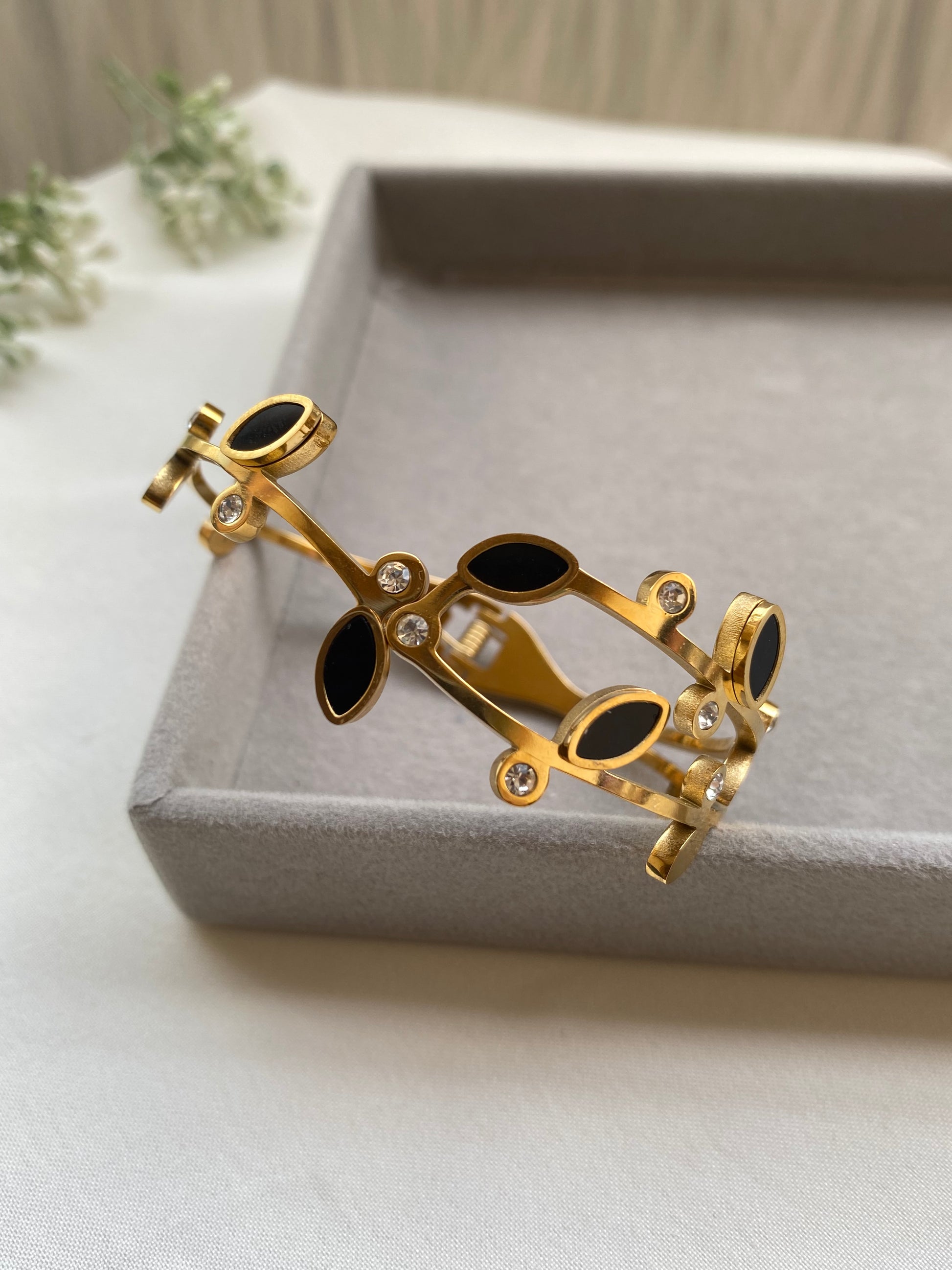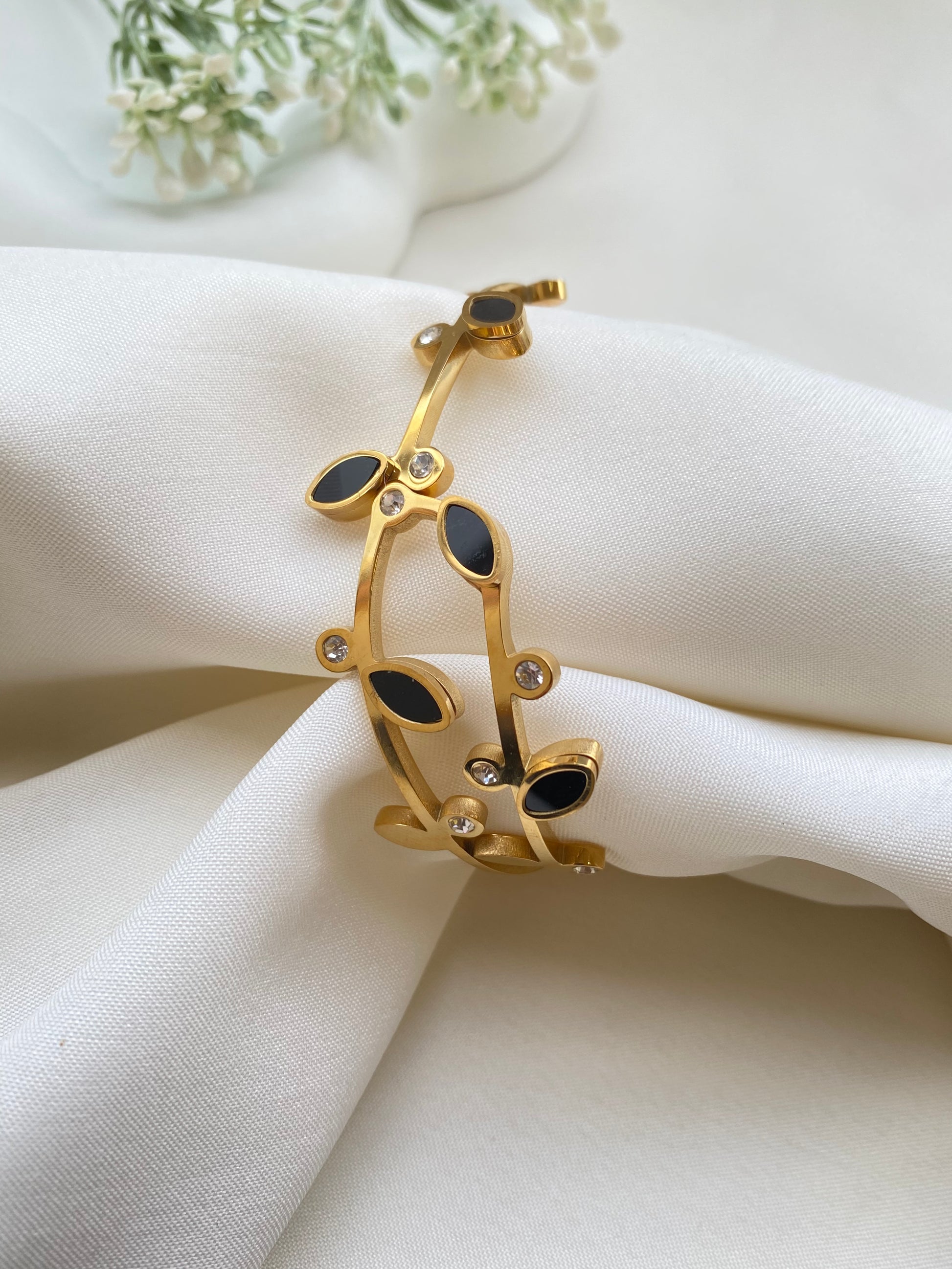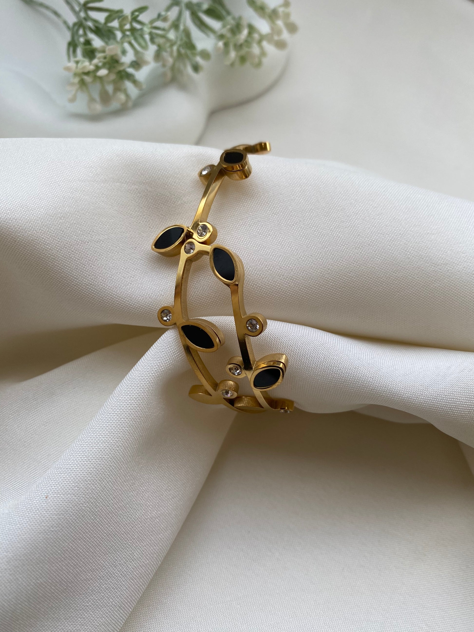 Elevate your style with our exquisite Gold Plated Leaf Design Black and Gold Plated Bangle Bracelet. Designed to add a touch of elegance to any outfit, this bracelet is crafted with meticulous attention to detail and features the following standout qualities.