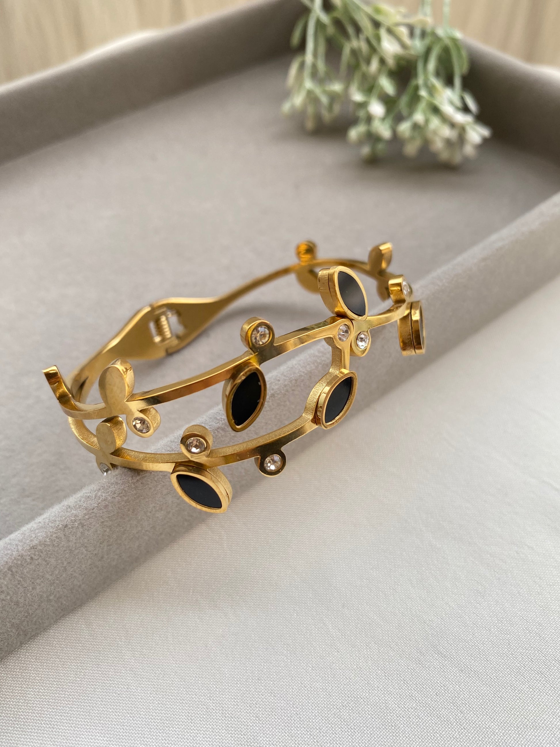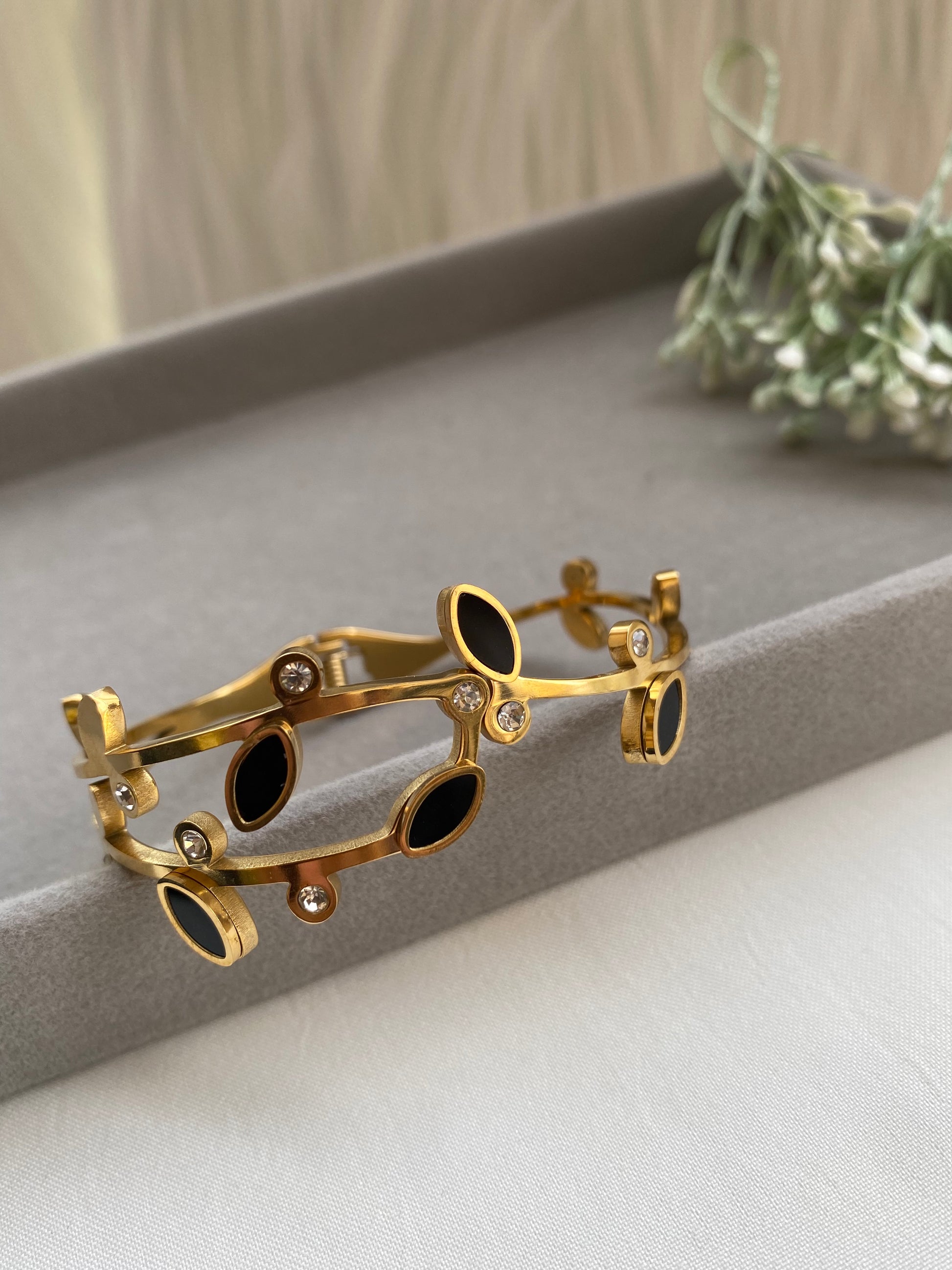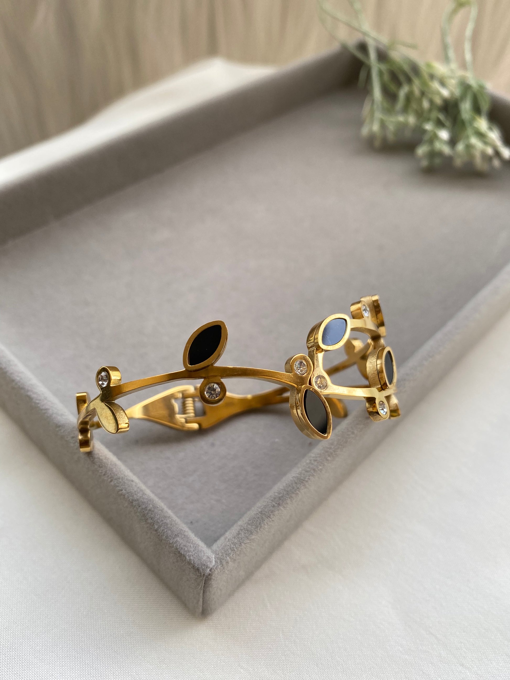 Elevate your style with our exquisite Gold Plated Leaf Design Black and Gold Plated Bangle Bracelet. Designed to add a touch of elegance to any outfit, this bracelet is crafted with meticulous attention to detail and features the following standout qualities.