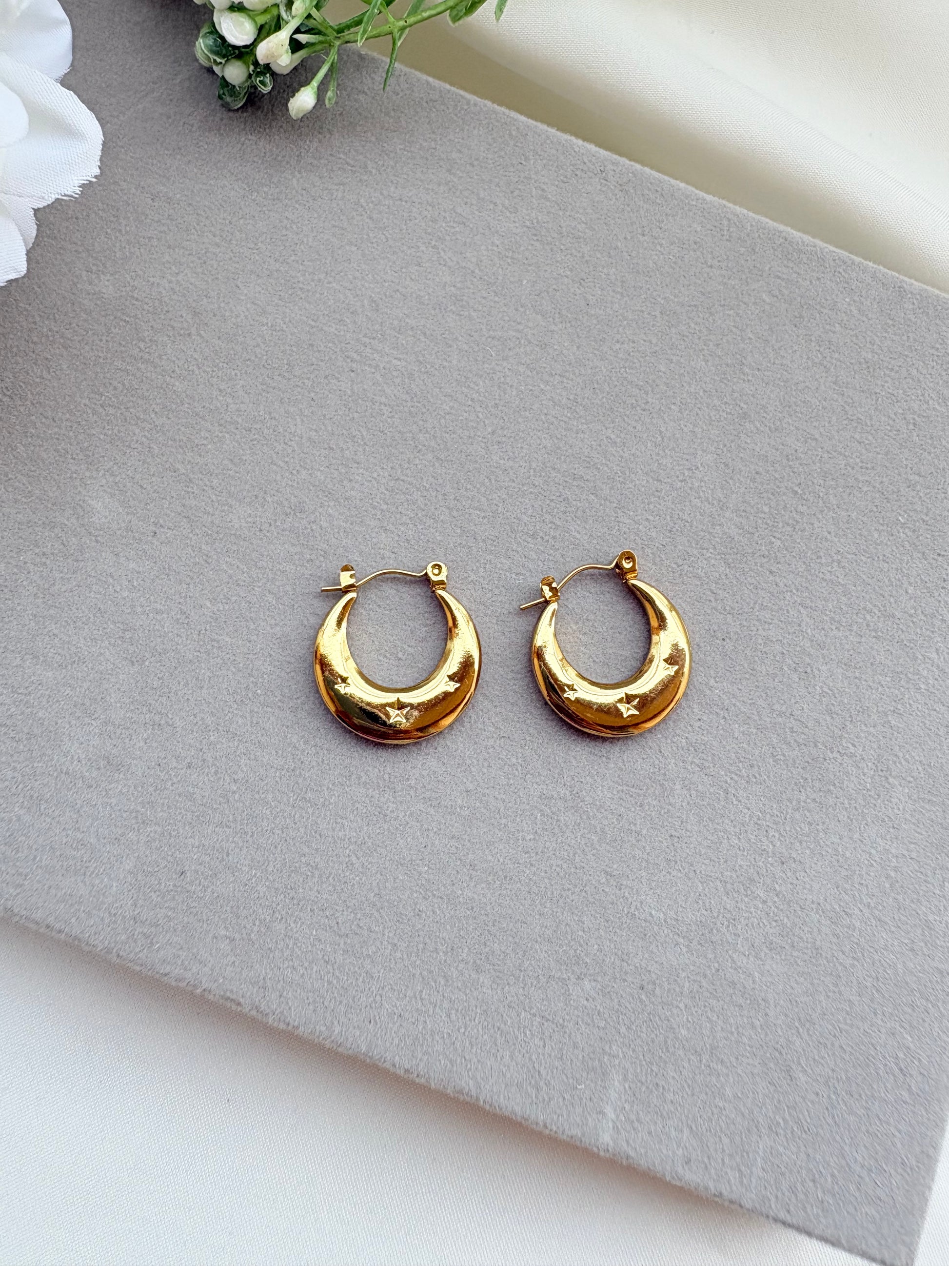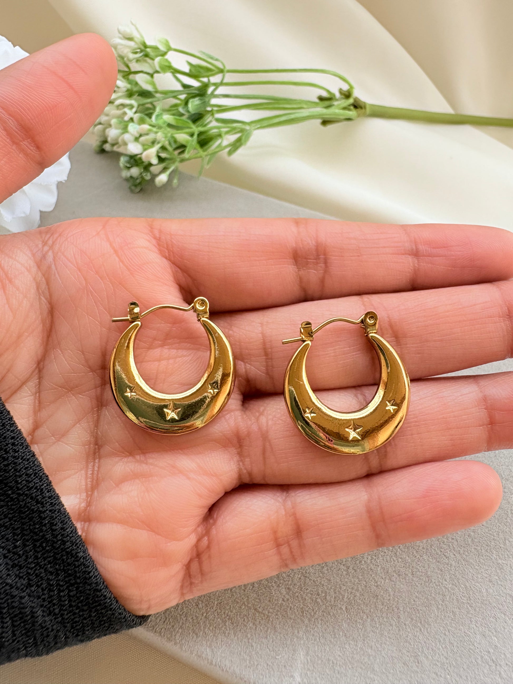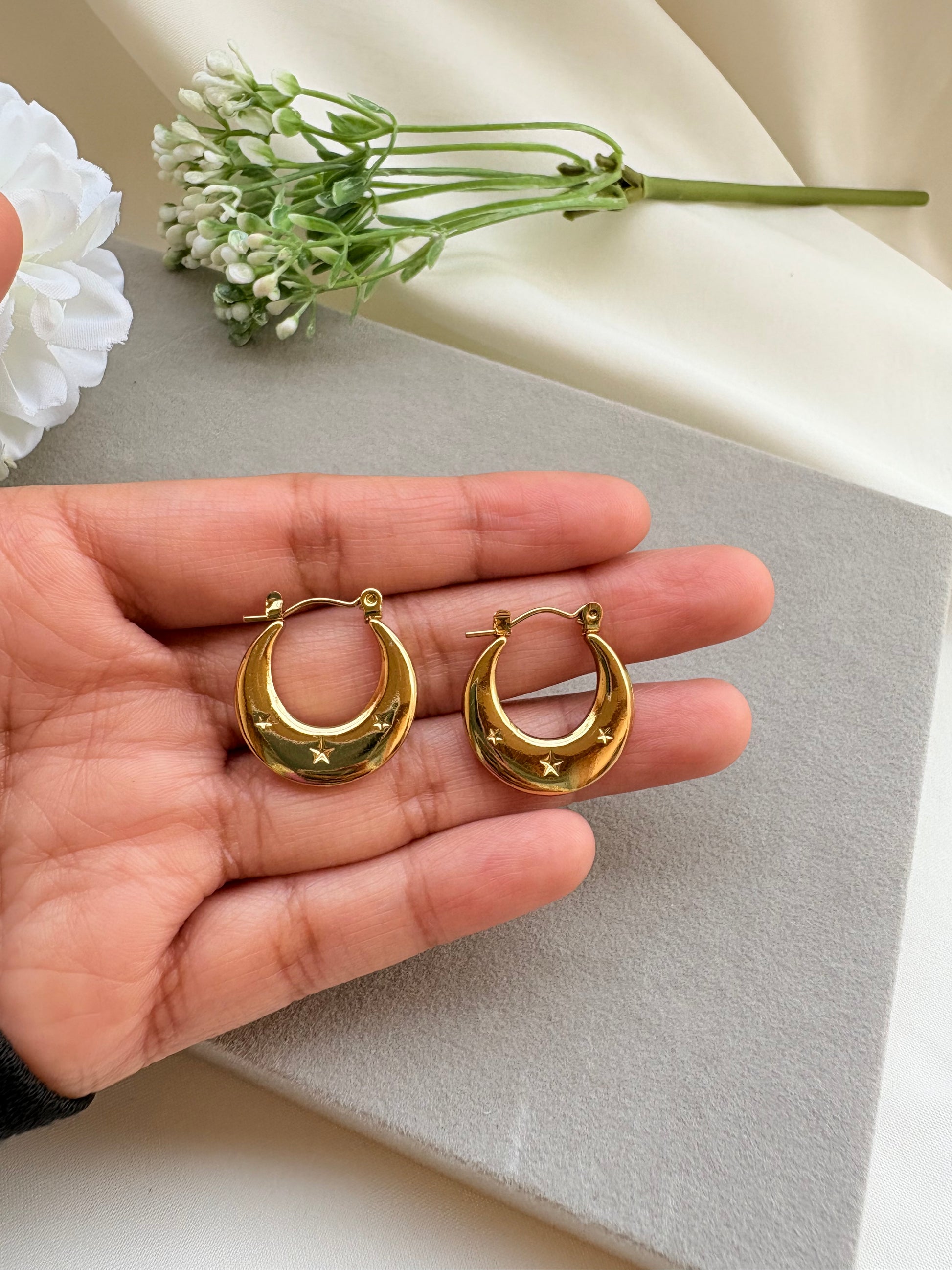 Gold Pleated Star Plus Moon Hoop Earrings - Anti-Tarnish