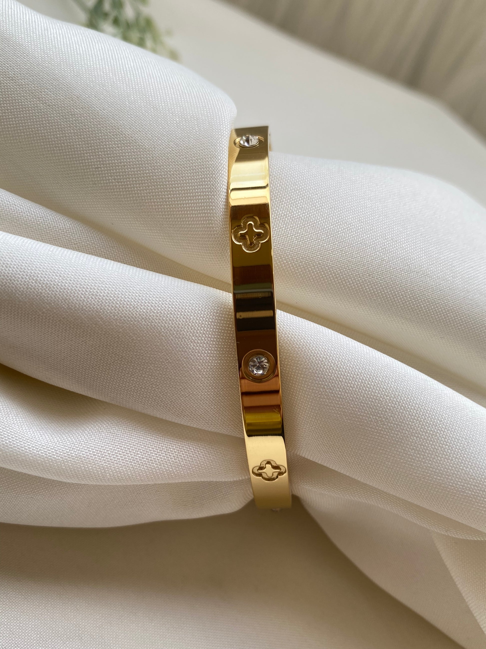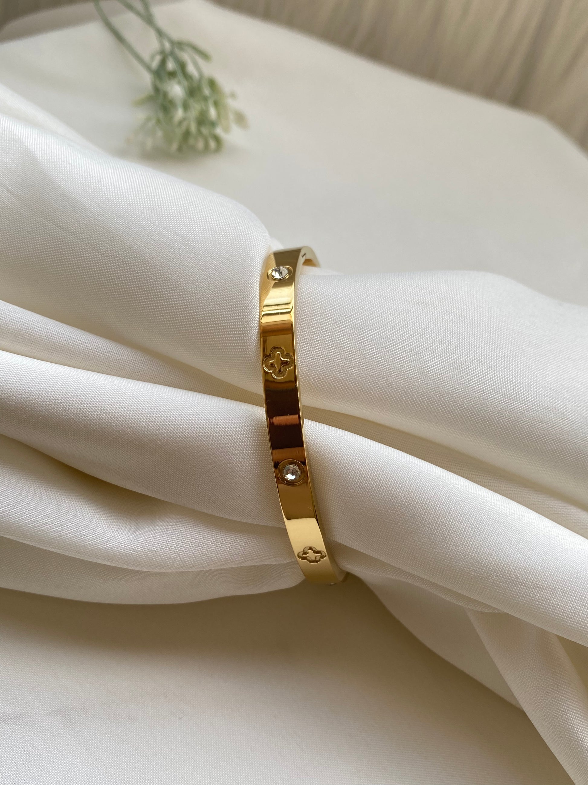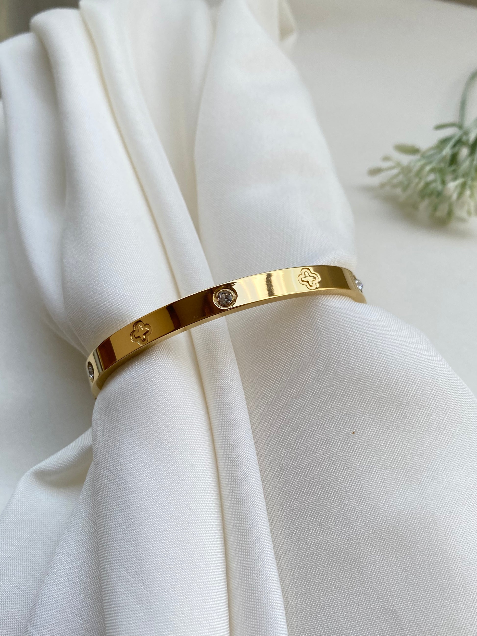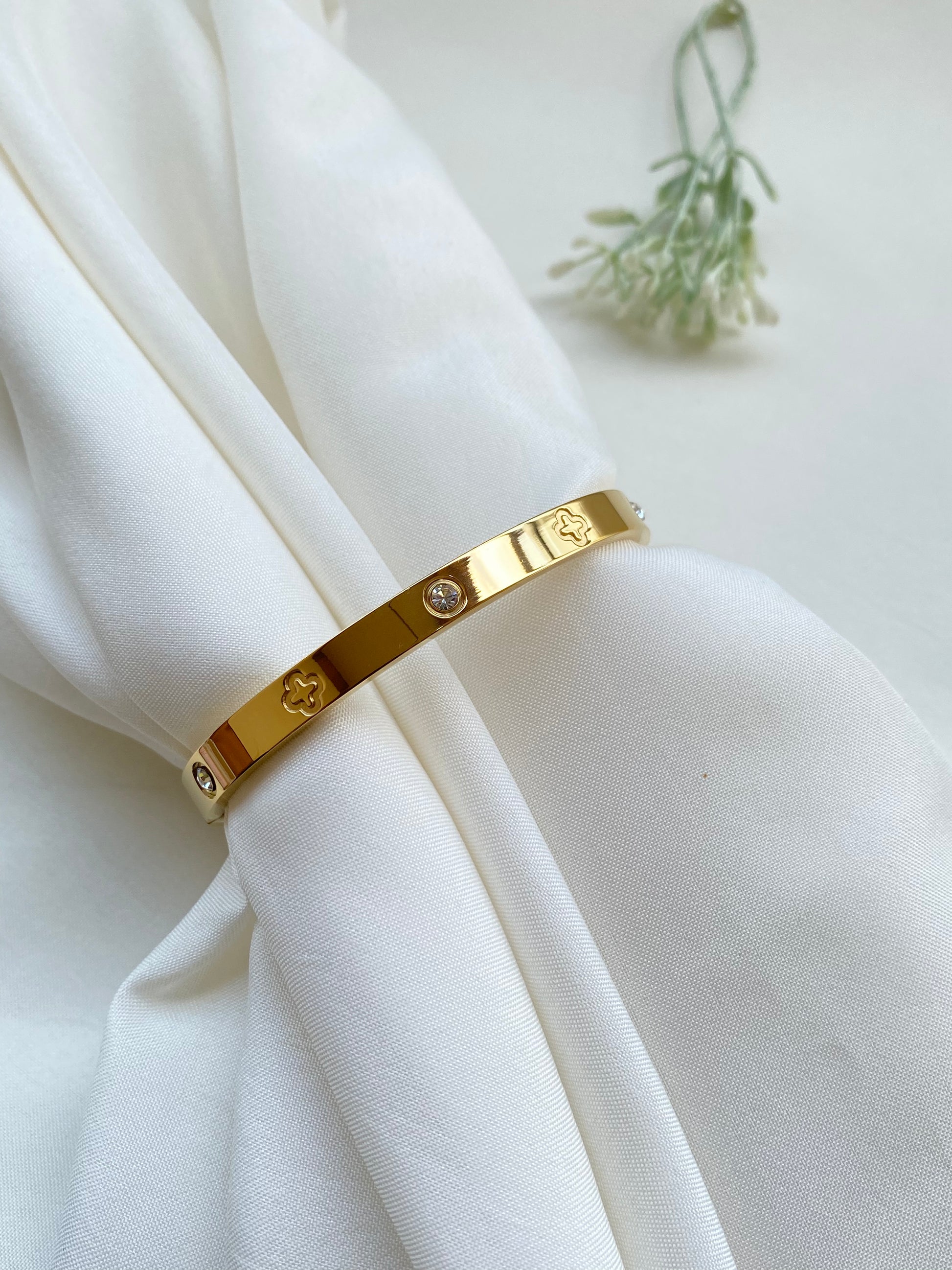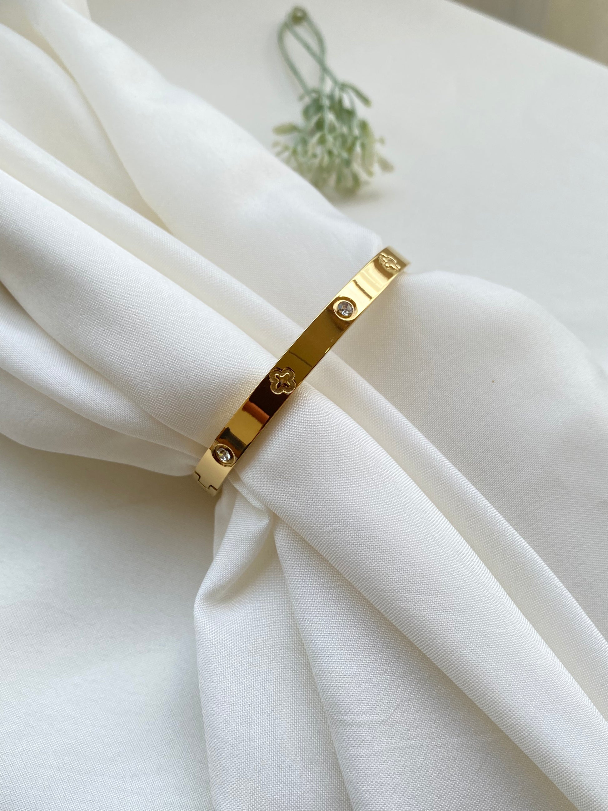 Introducing our exquisite Gold Bangle with Hidden Clasp, a timeless piece of jewelry that exudes elegance and sophistication. Crafted from a durable alloy and adorned with brilliant American diamonds, this bangle is the perfect blend of simplicity and luxury.