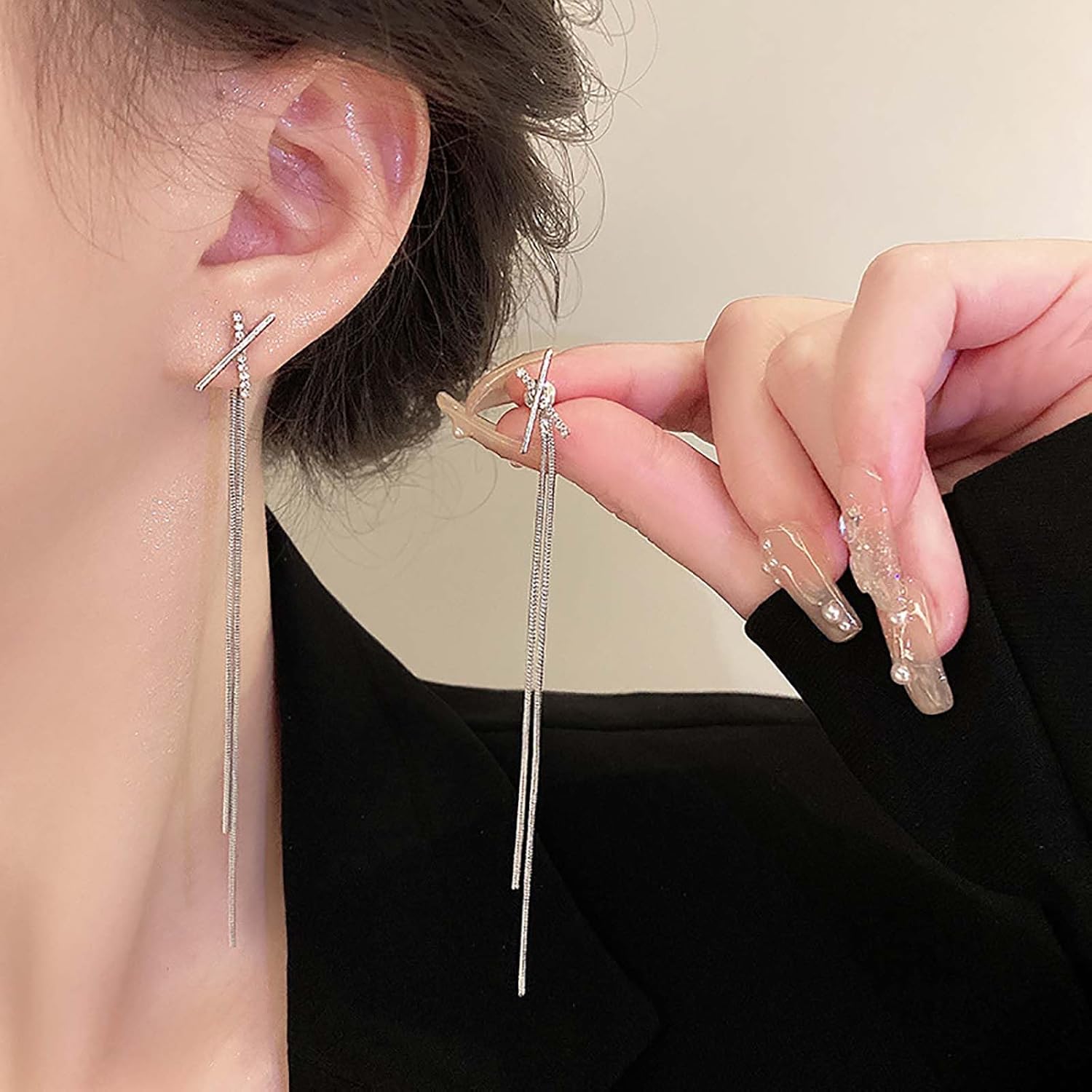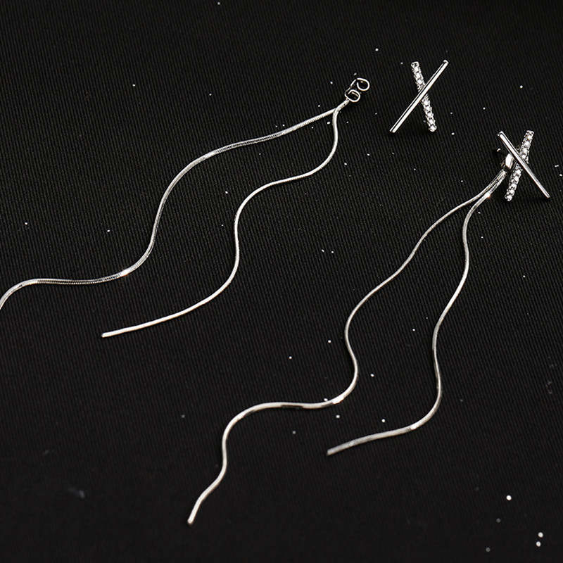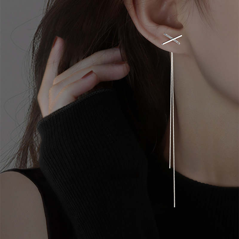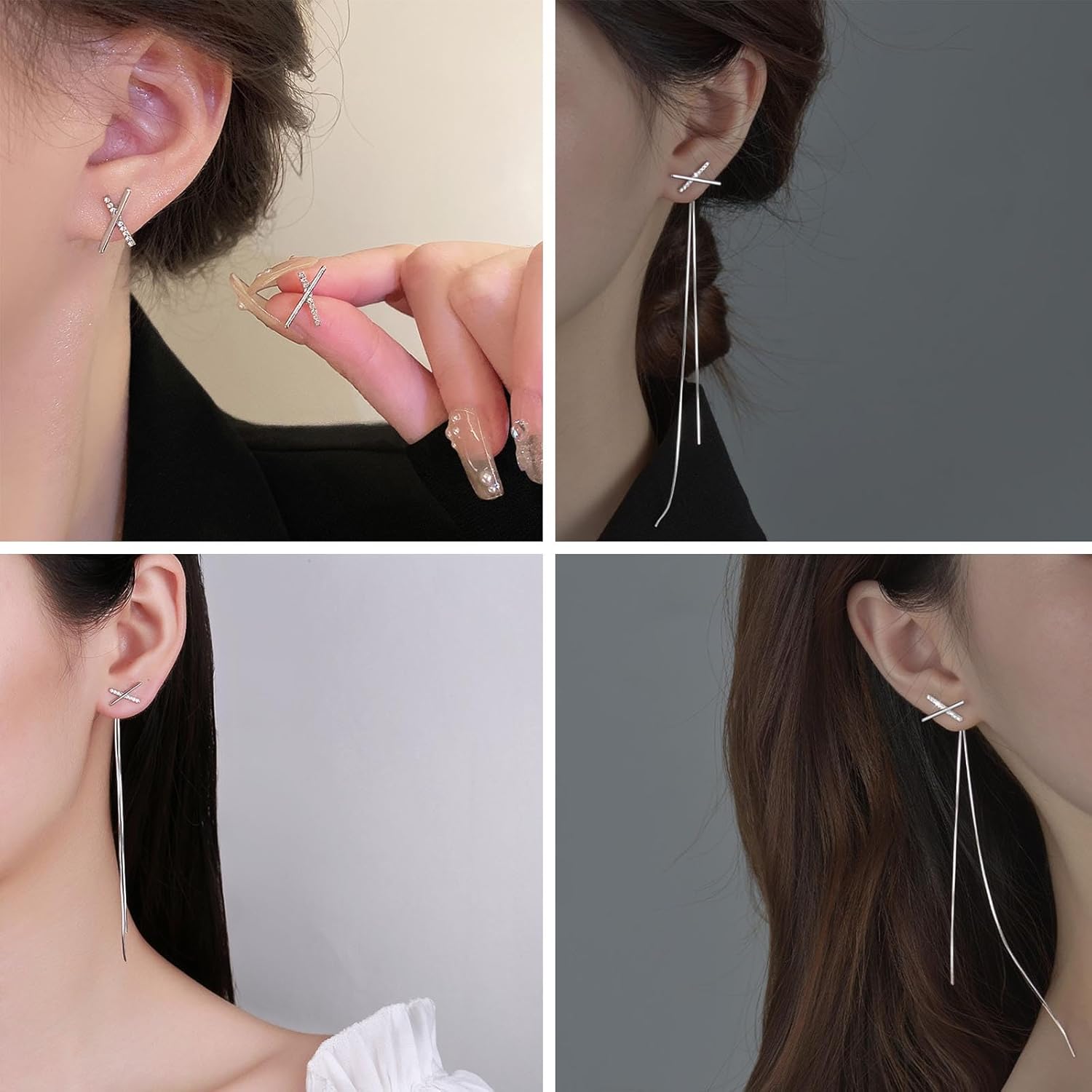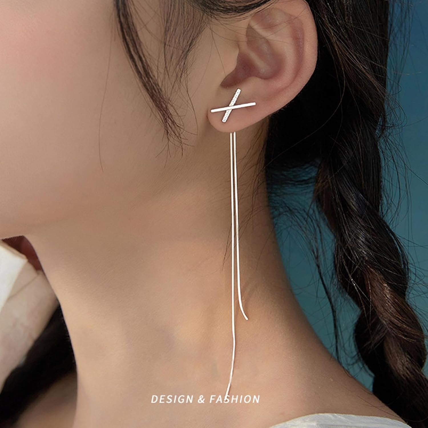These fashionable earrings feature a sleek crossover design with flowing tassels, perfect for adding a chic vibe to any outfit. Lightweight and versatile, they're ideal for parties, casual outings, or elevating your everyday style. Make a statement with these stunning silver earrings.