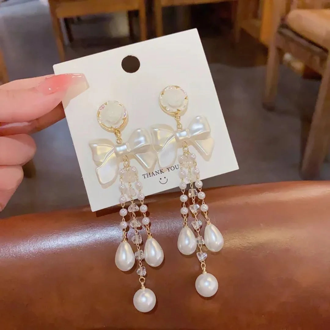 These dangle earrings feature gold chains of different lengths, each hung with a lustrous pearl. This unique layered design adds depth and movement, making them a standout accessory for any occasion.
