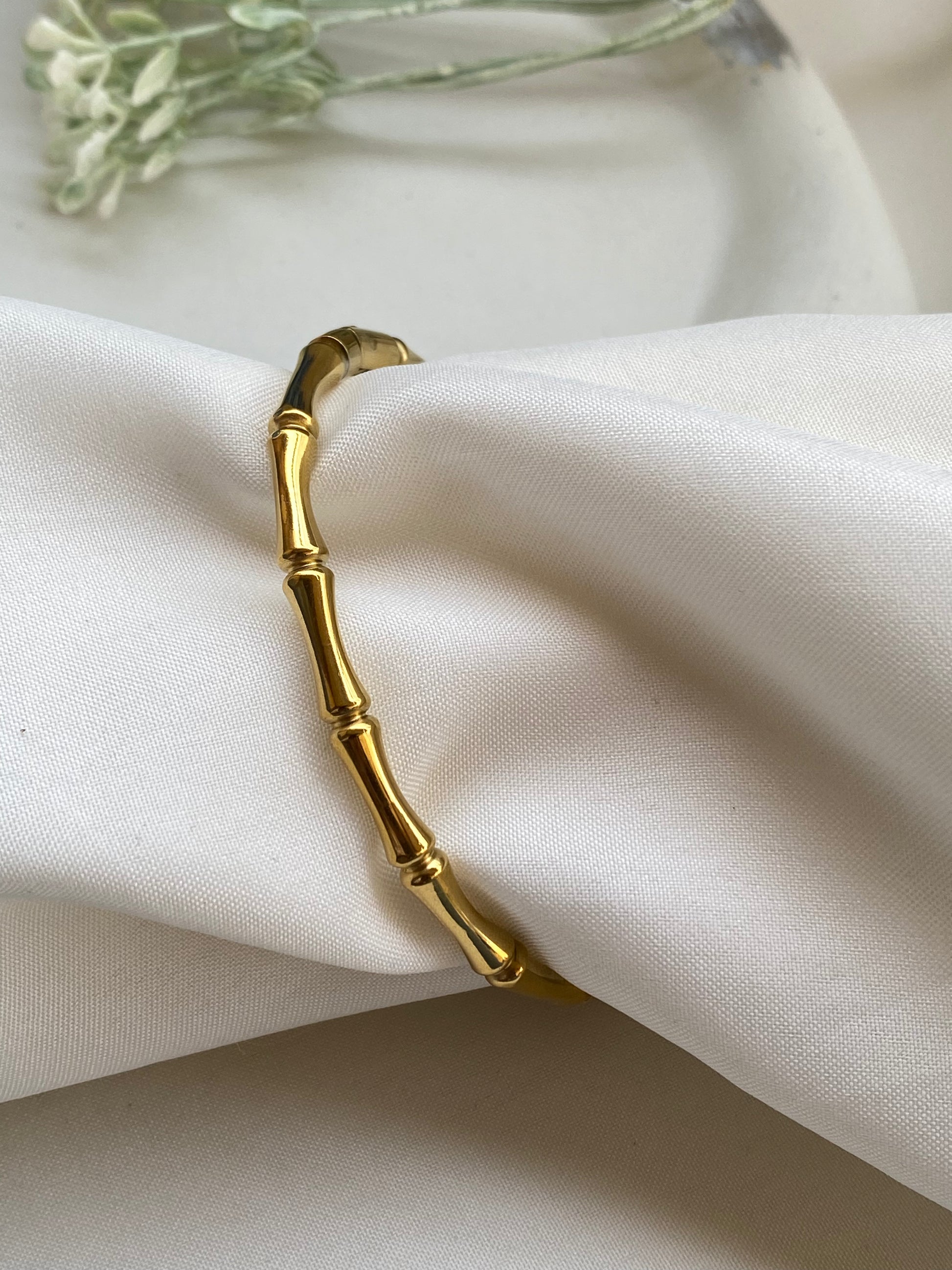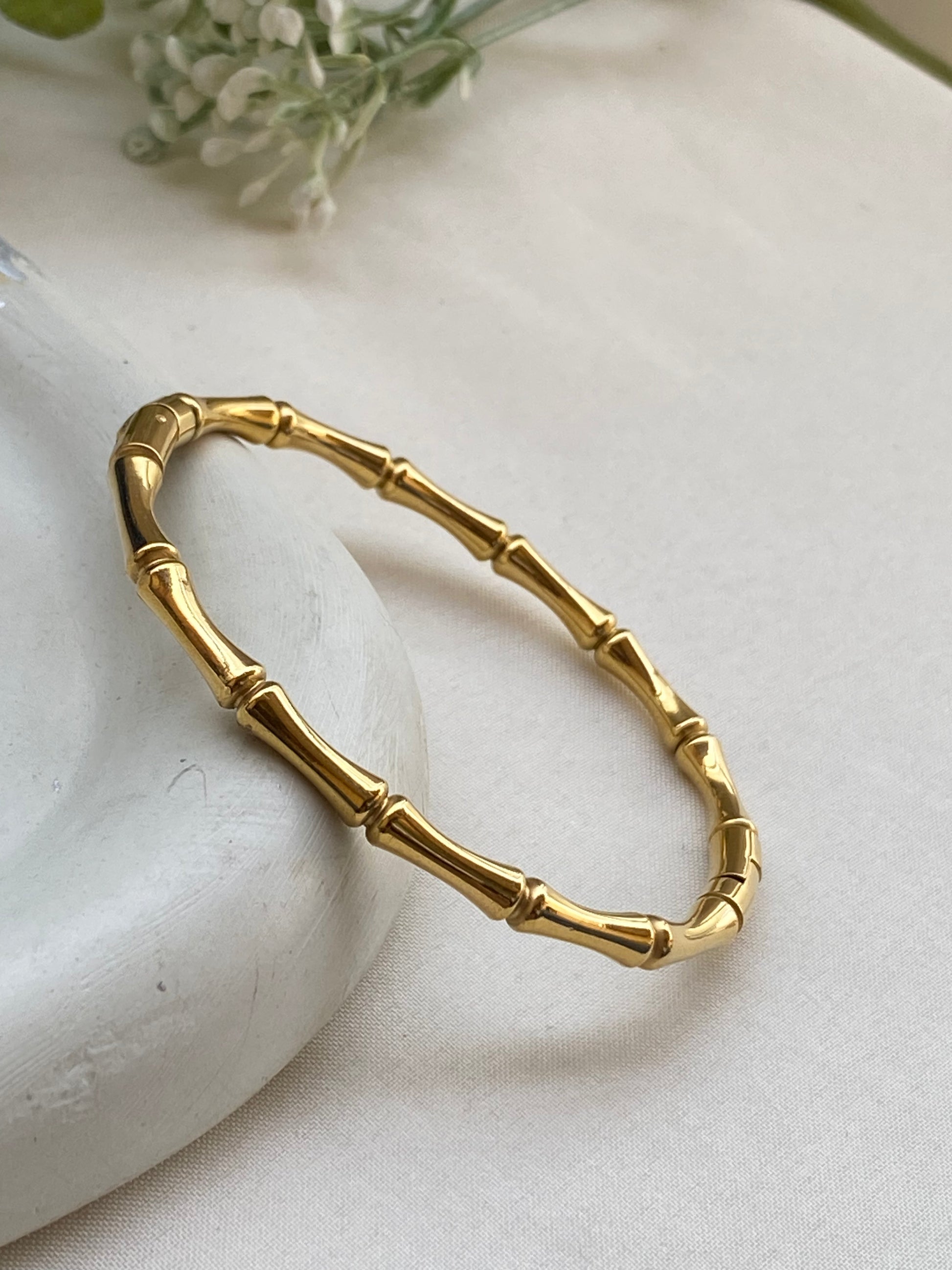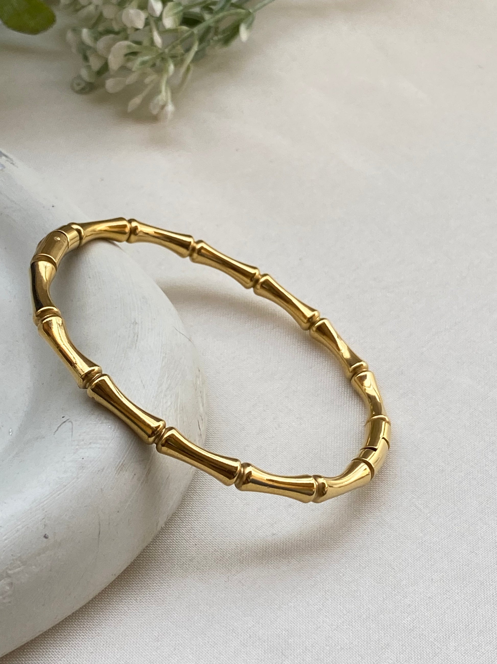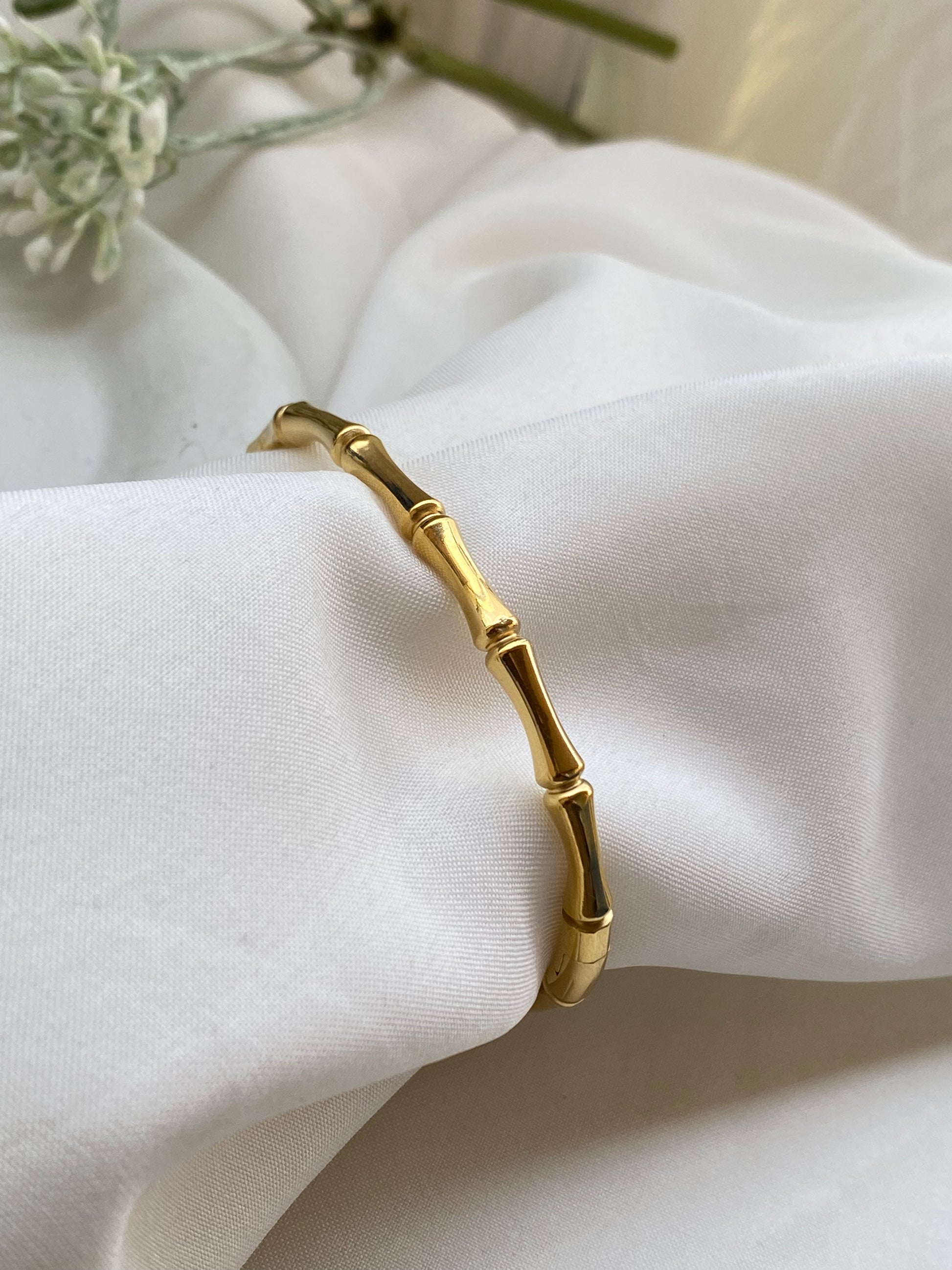 This gold-plated bangle bracelet features a unique bamboo design, adding a touch of sophistication and natural beauty to any outfit. Its timeless look is perfect for both everyday wear and special occasions.
