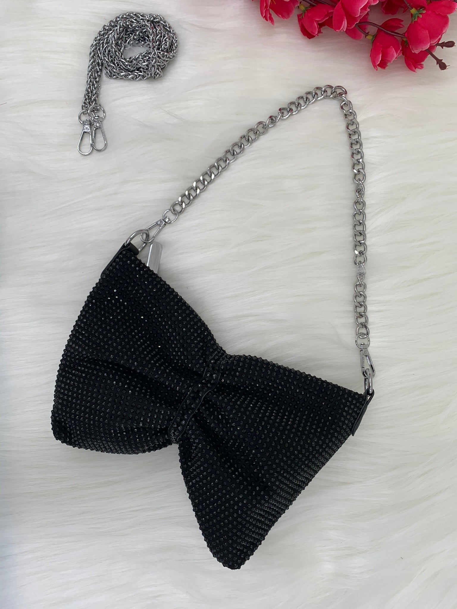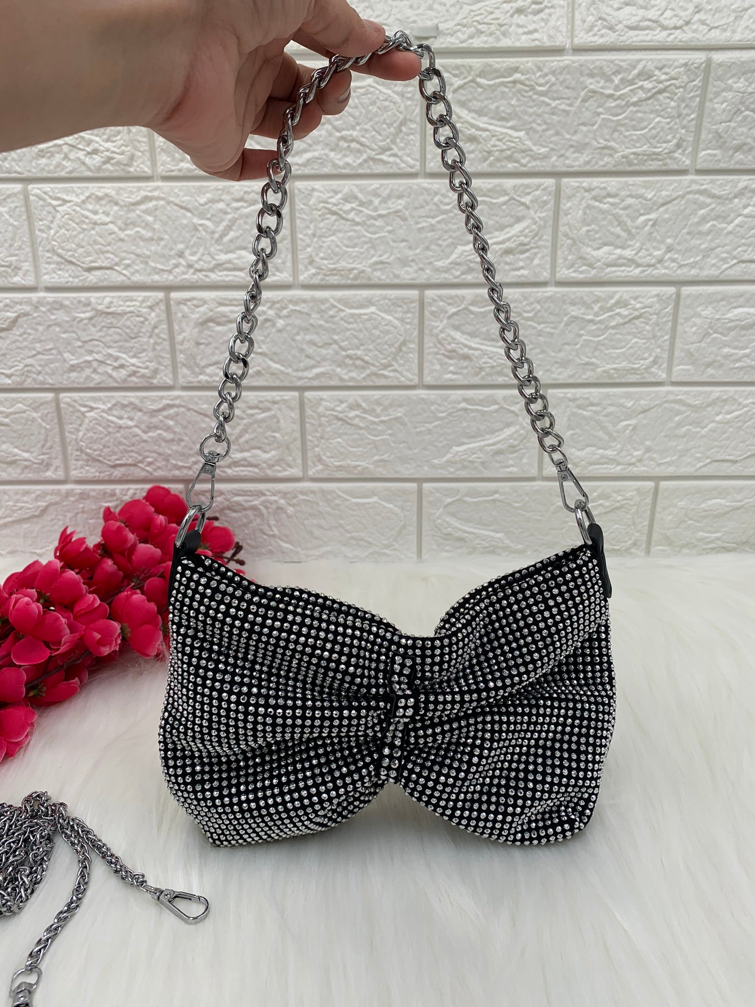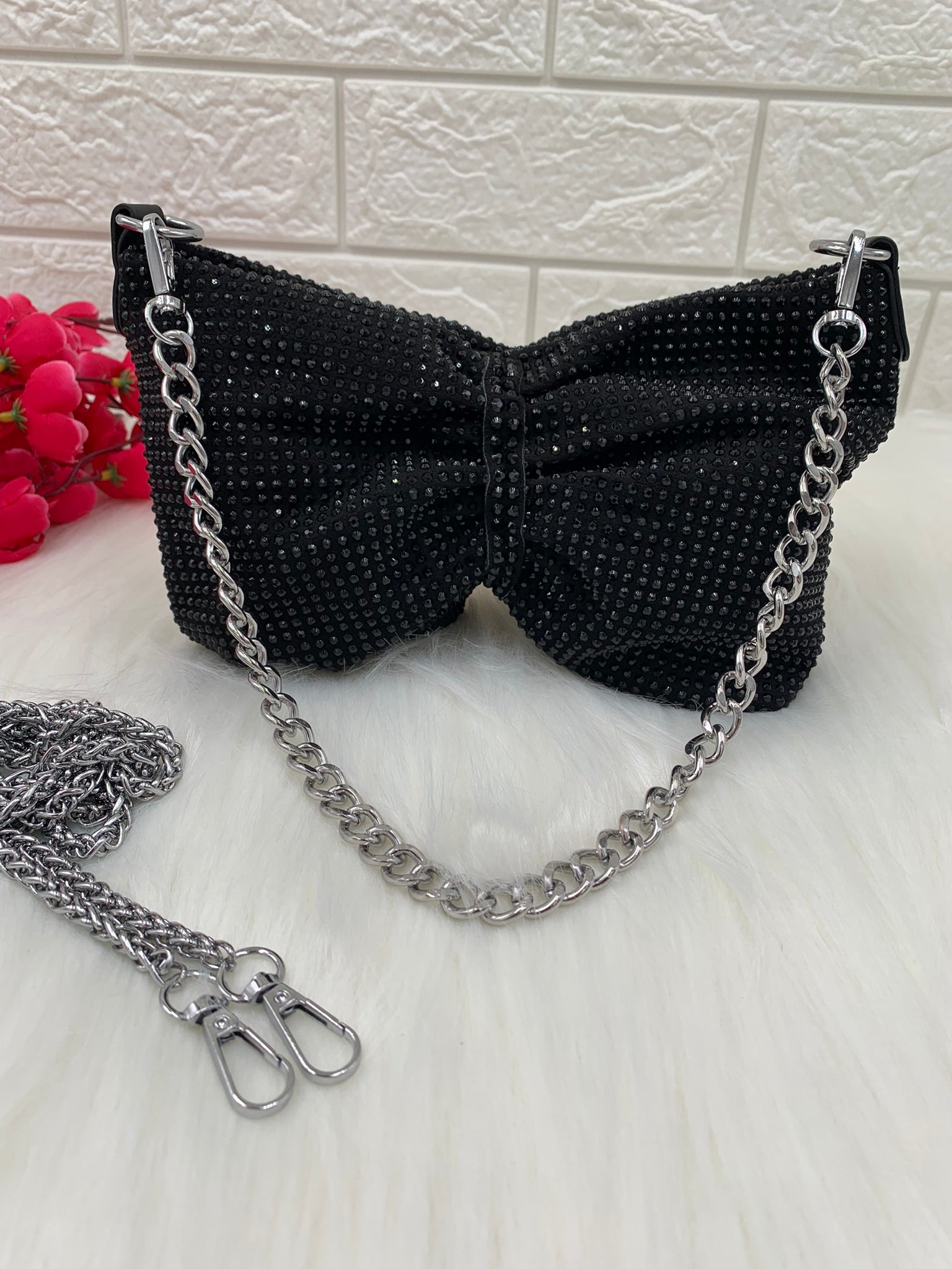 Bow Look Stone-Embellished Shoulder Bag with Sling Chain