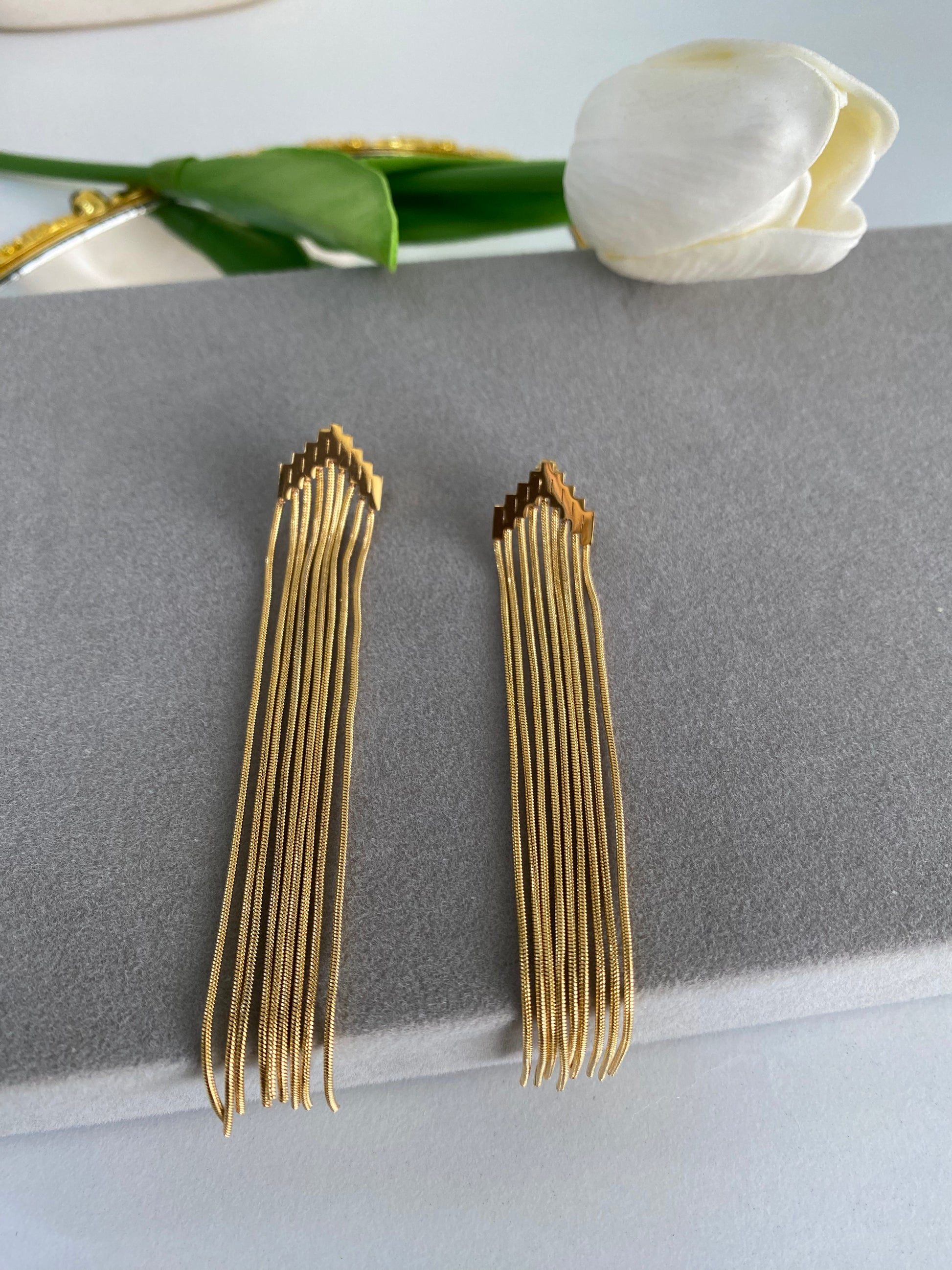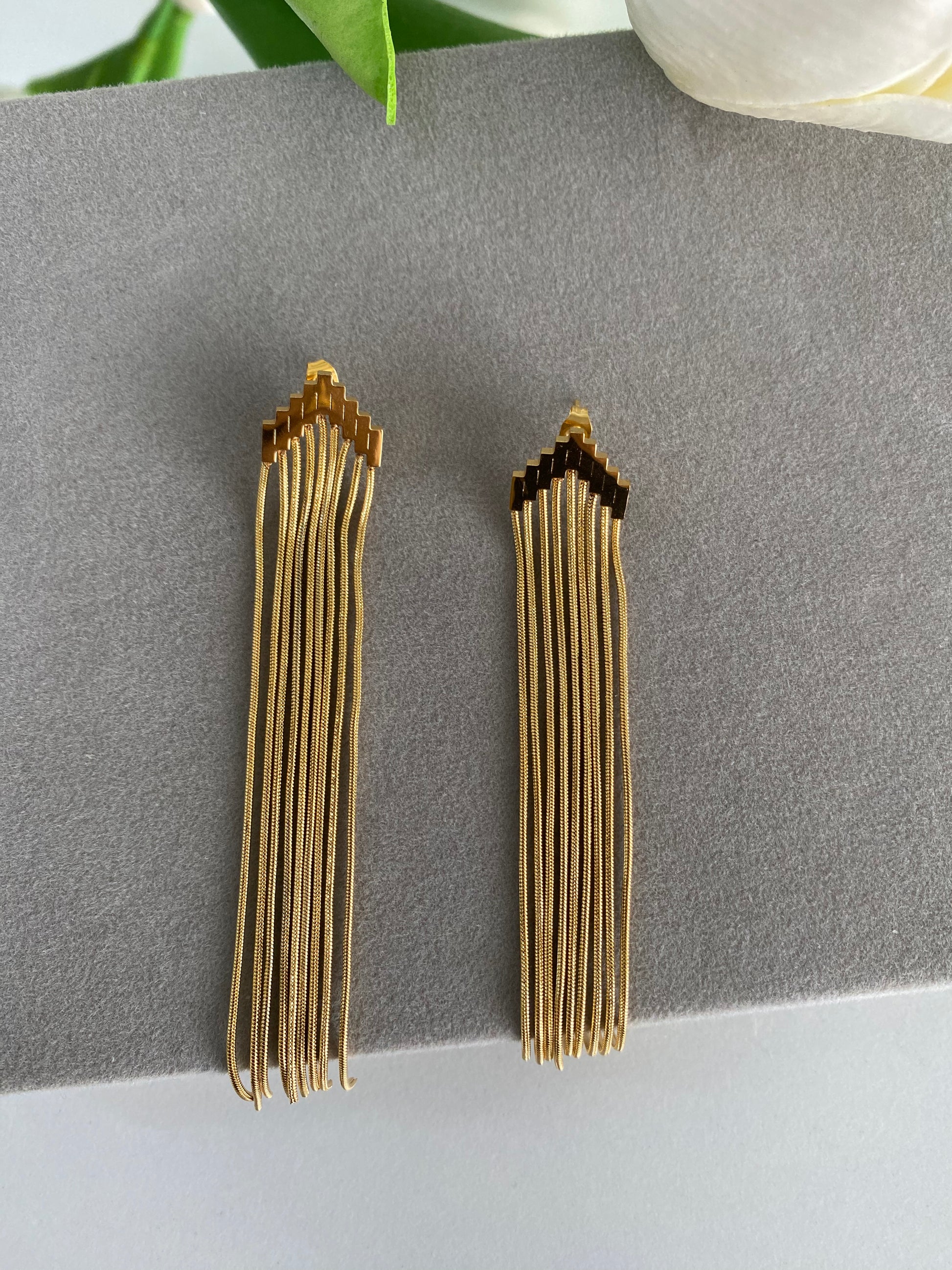 Chain Tassle Danglers Stainless Steel Gold Pleated Earrings