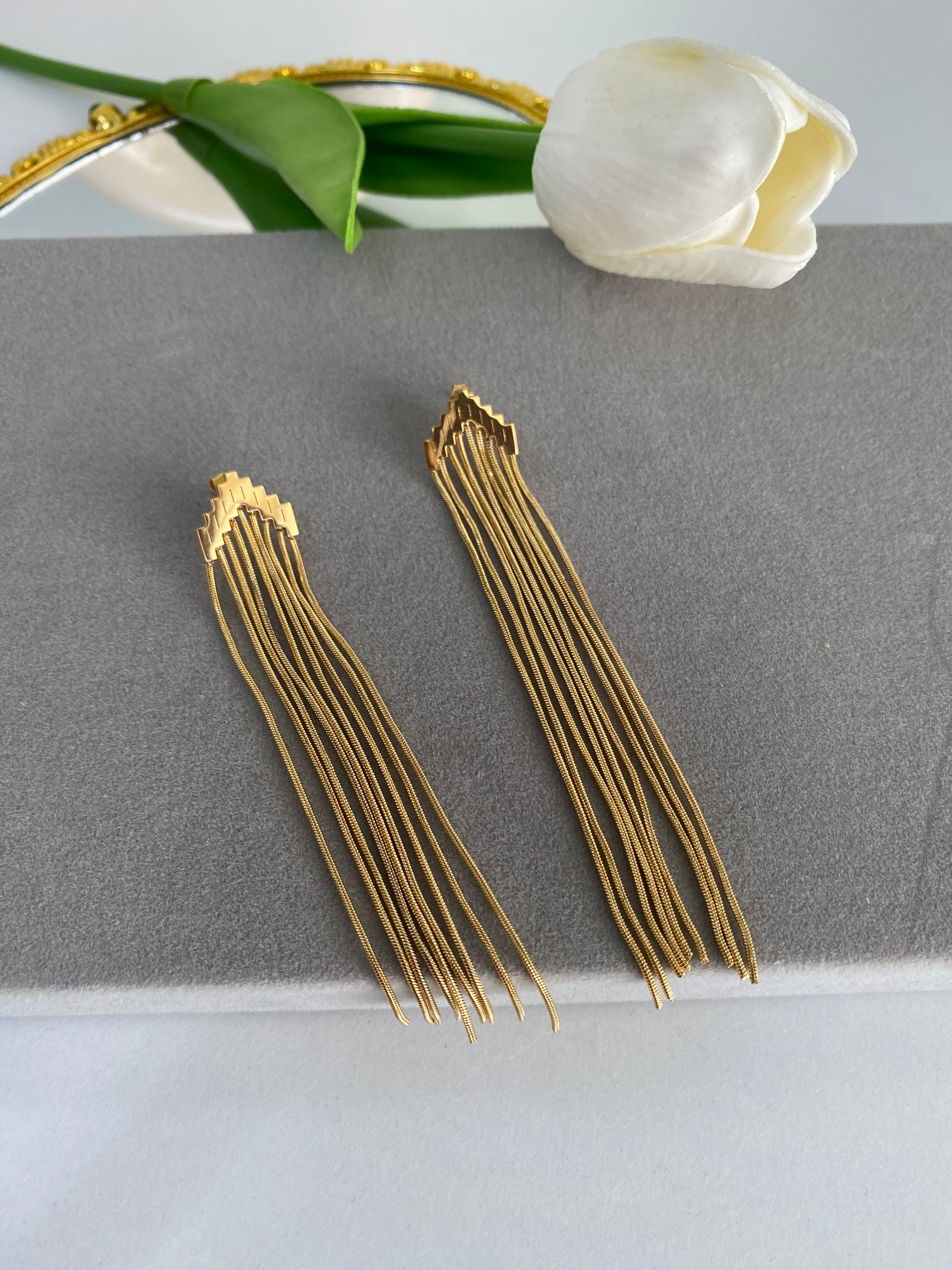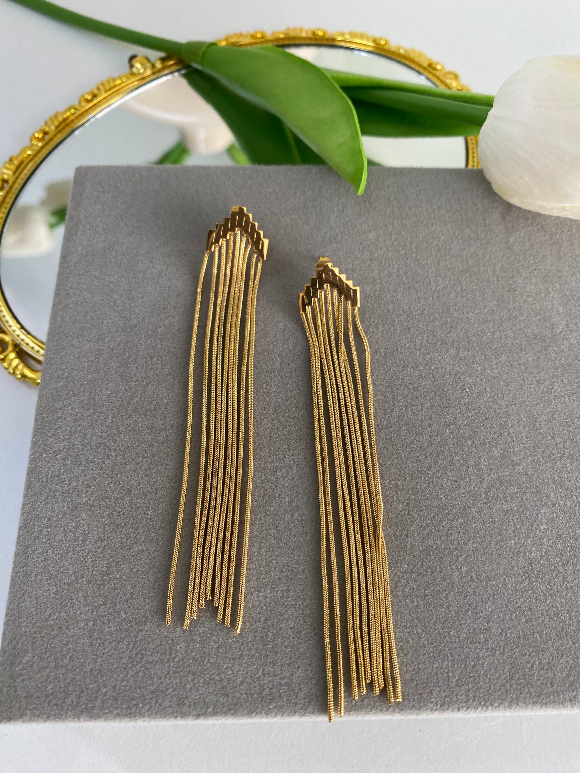 A perfect blend of elegance and fun. These statement earrings are designed to make you stand out at any event. The long, cascading tassels create a dynamic and eye-catching effect, adding movement and flair to your outfit. Made from high-quality materials, they are lightweight yet durable, ensuring comfort throughout the night. Whether you’re dressing up for a formal event or adding a touch of glamour to a casual look, these earrings are the ideal accessory to make a lasting impression.
