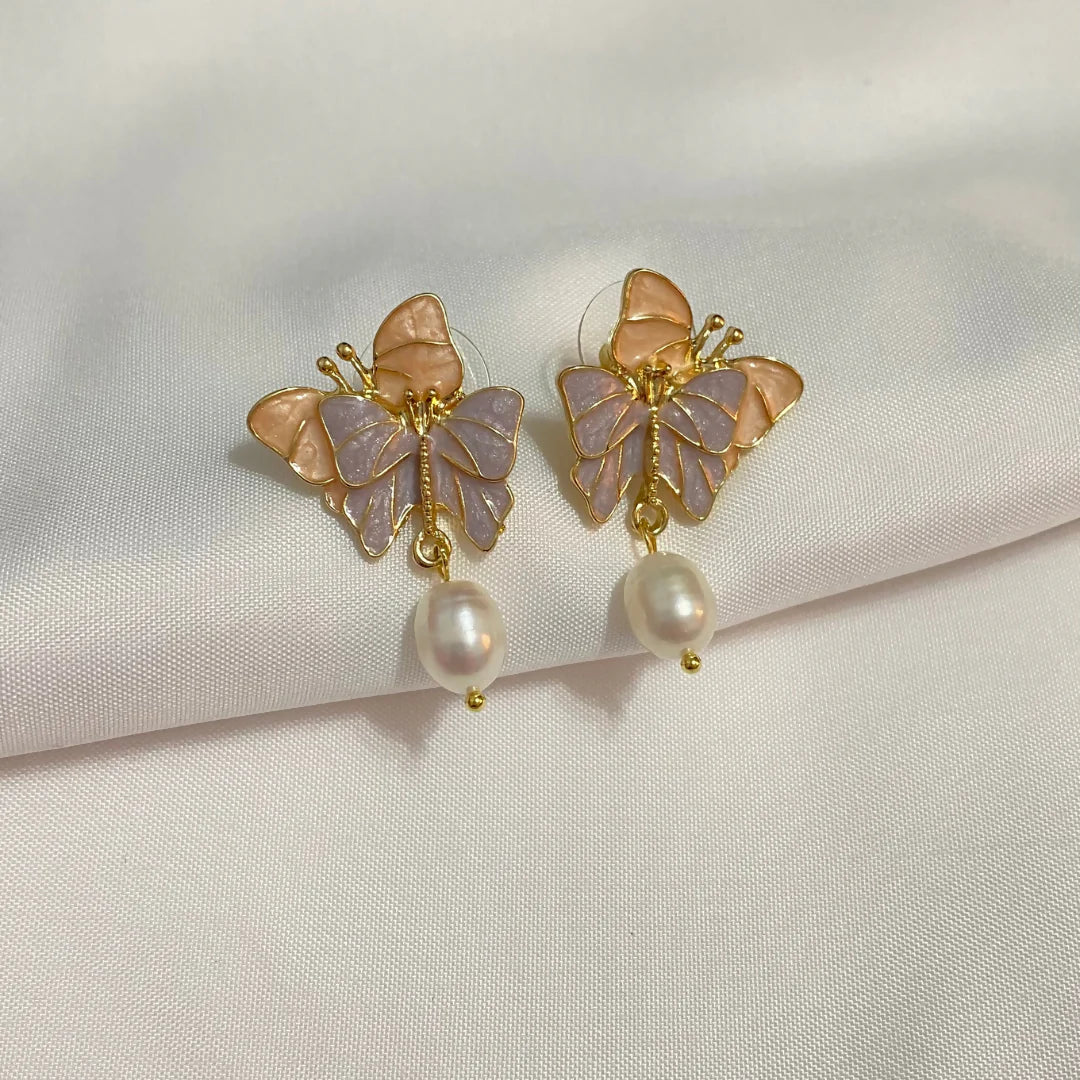 These dainty earrings showcase beautifully crafted butterfly designs with delicate pink accents, adding a touch of dreamy charm to your accessory collection. Perfect for adding elegance to any look.