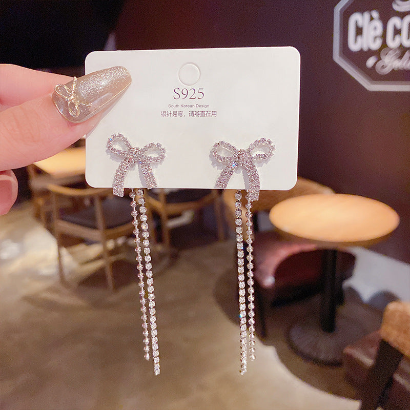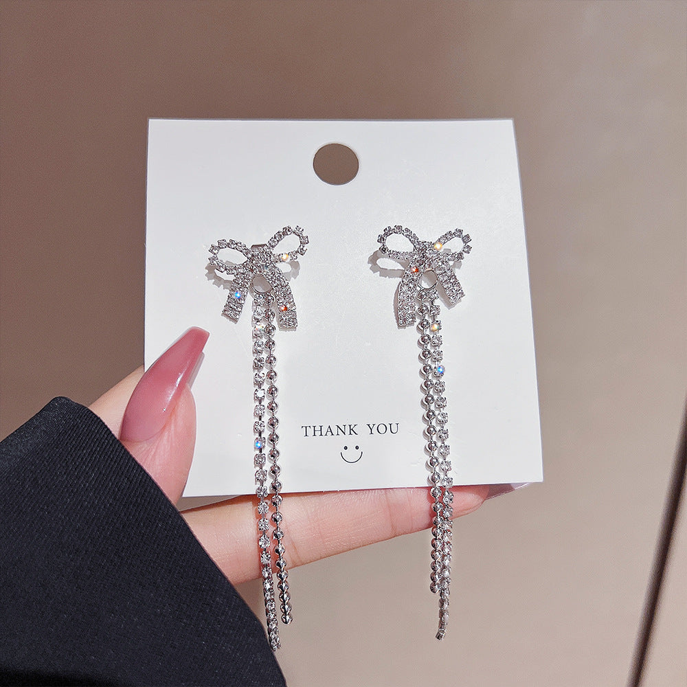 Make a sparkling statement with these dazzling bow earrings, featuring elegant rhinestones and flowing tassels. Designed to complement your party outfits, they are lightweight and comfortable for all-night wear. Add a touch of glamour and charm to your look with these stunning earrings.