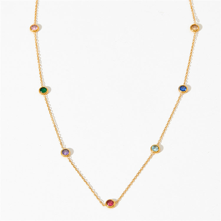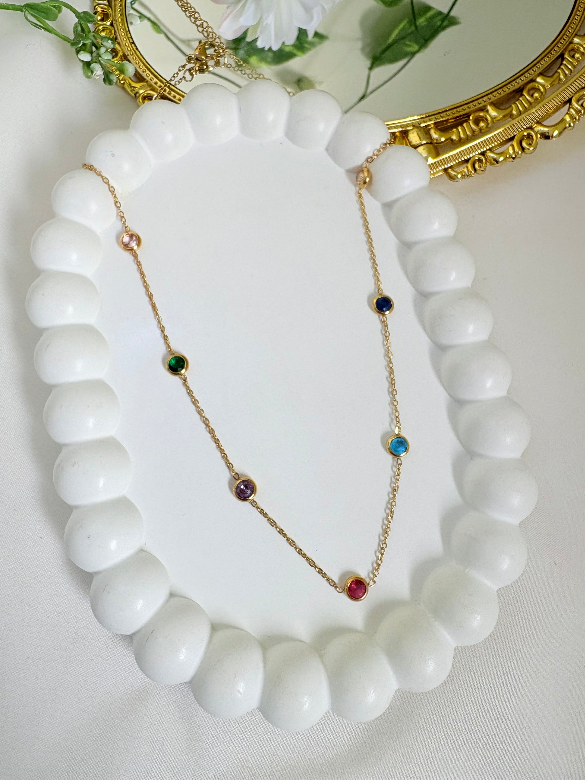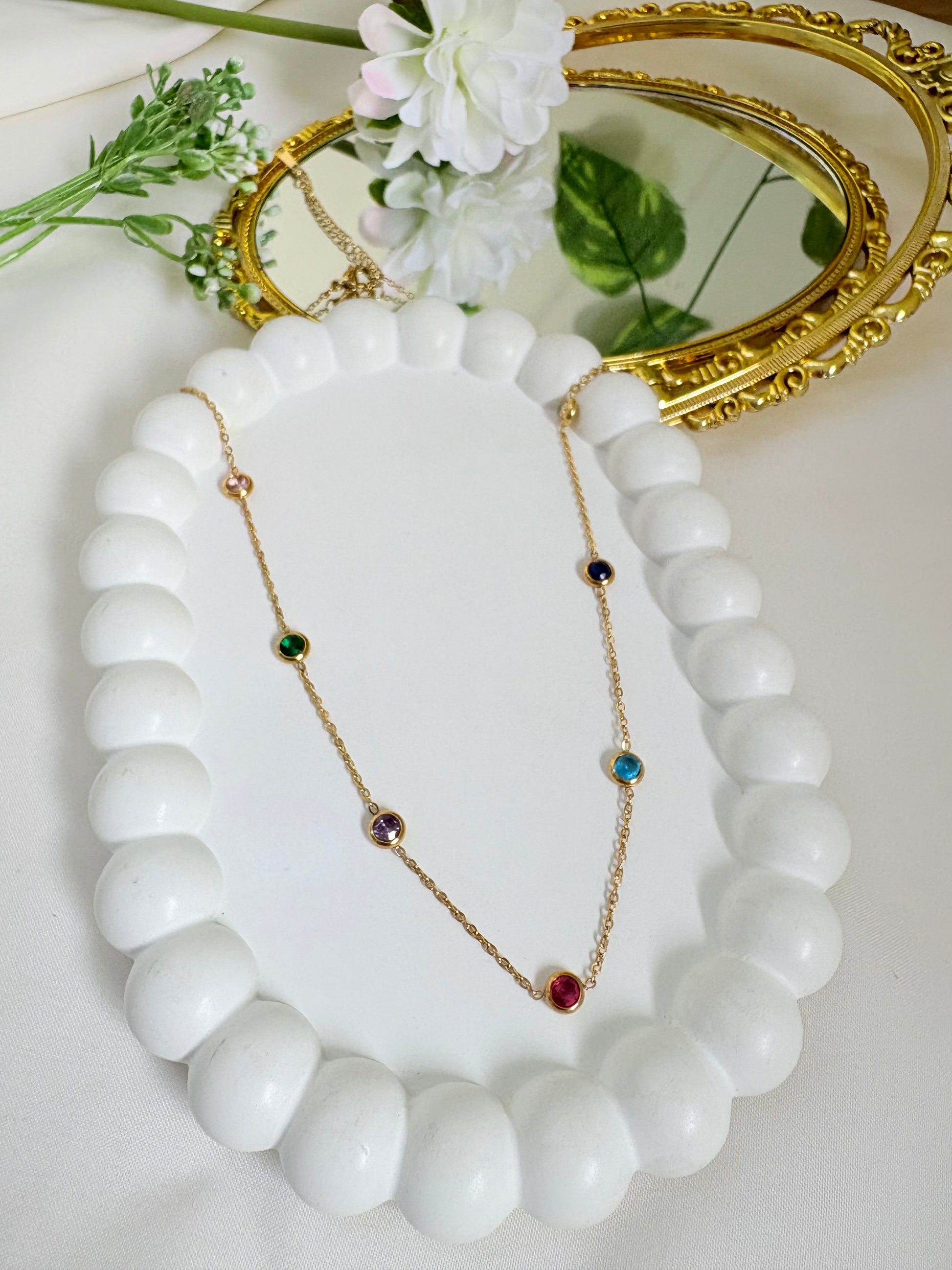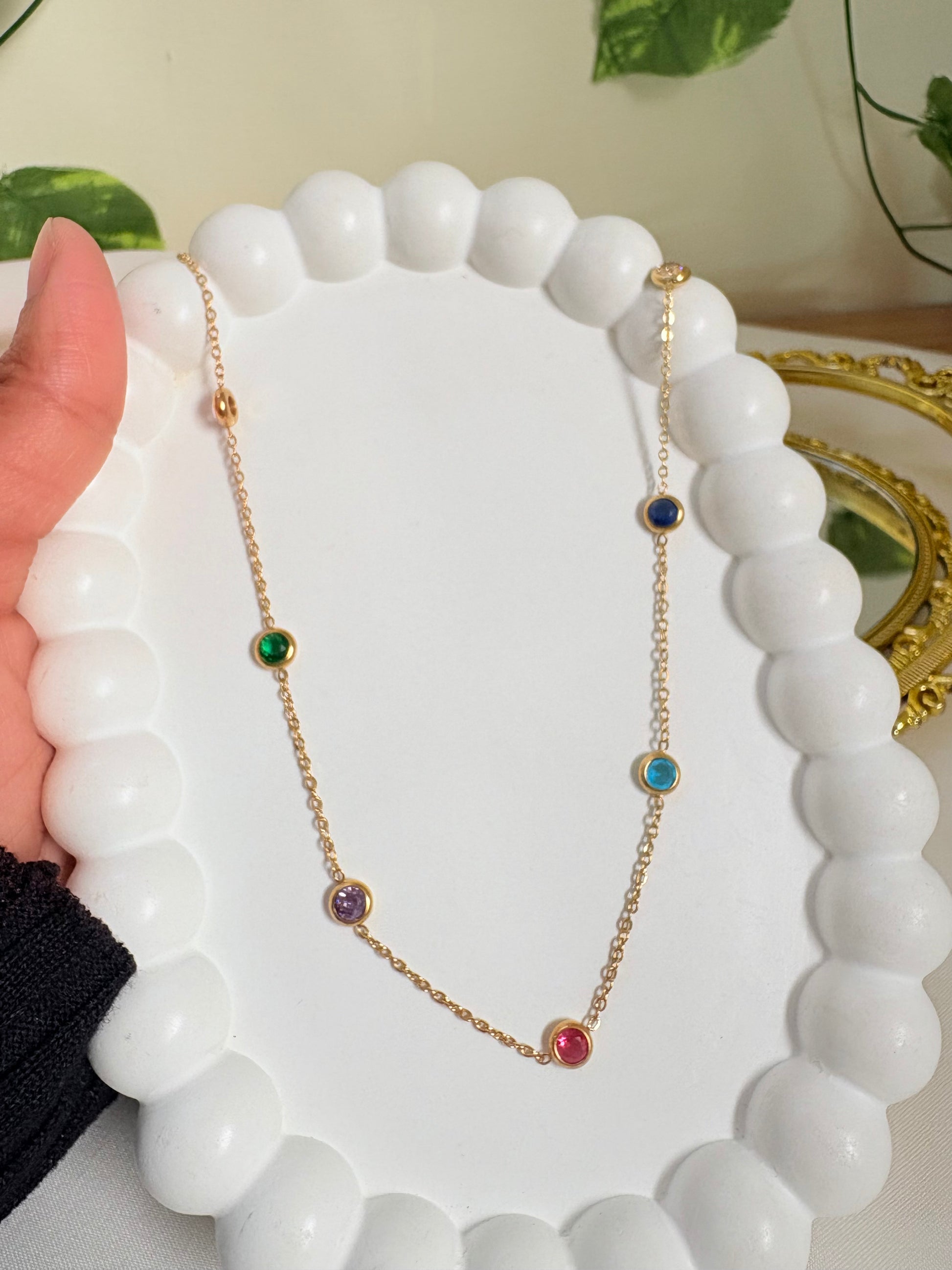 Add a pop of color to your look with this stunning colorful gemstone chain necklace. Featuring a delicate gold-plated chain adorned with vibrant, multi-colored gemstones, this piece is perfect for brightening up any outfit with effortless charm.